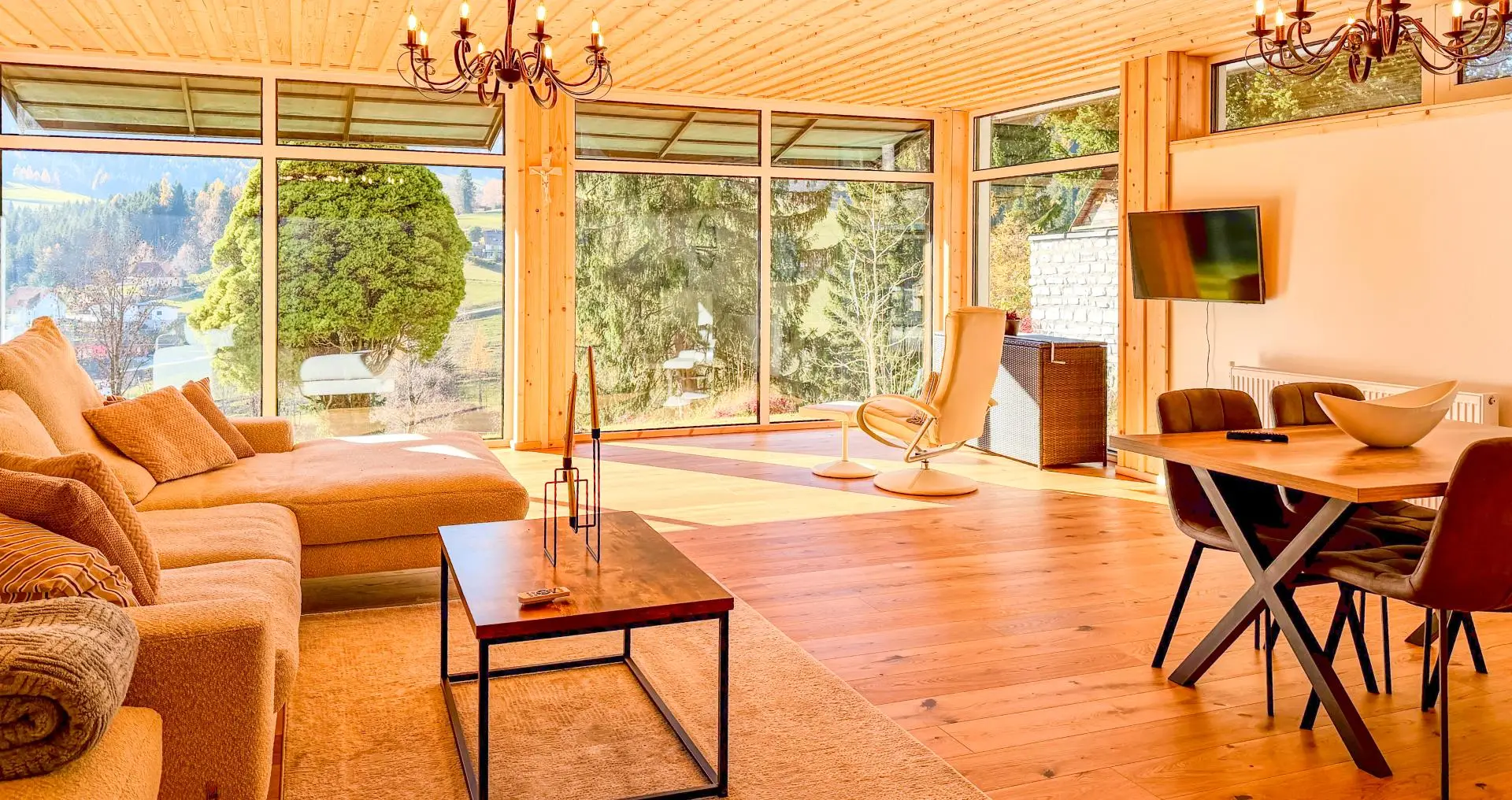 Die Kombination aus großzügigen Räumen, hochwertigen Naturmaterialien wie Zirben- und Fichtenholz sowie liebevollen Details verleiht dem Haus eine warme, einladende Atmosphäre.