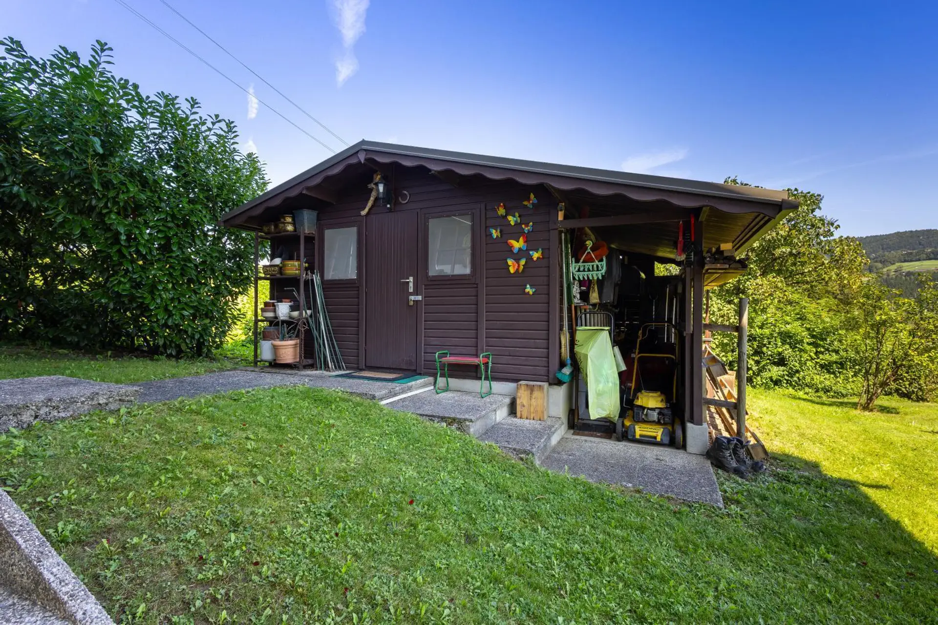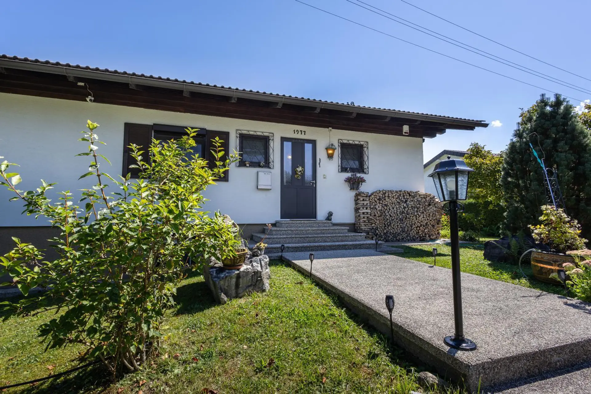 Dieser Bungalow mit rund 2.900 m² Garten bietet viel Platz für Familie, Hobbys und Erholung. Vom Wohnzimmer aus gelangen Sie direkt auf die Terrasse und den Balkon – mit wunderschönem Blick über die Drau.