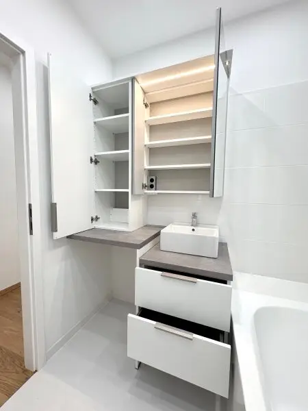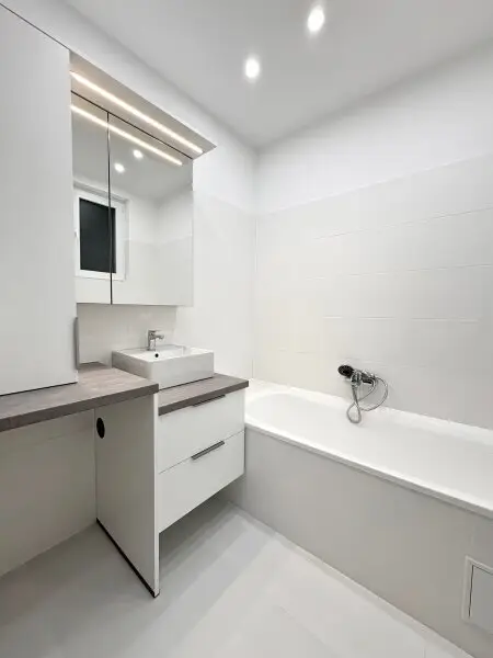 * Bad mit Badewanne, Fenster, Waschmaschinenanschluss und Tischlermöbeln