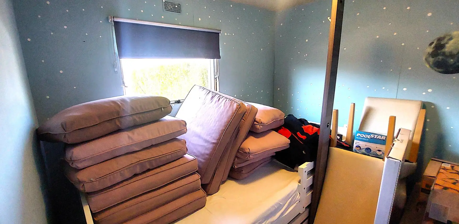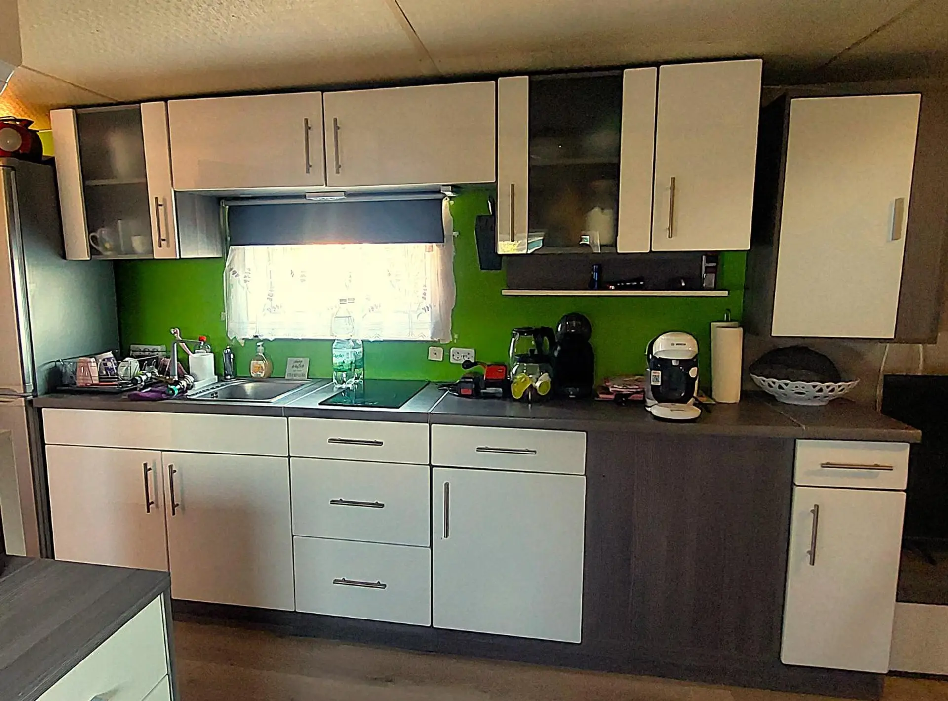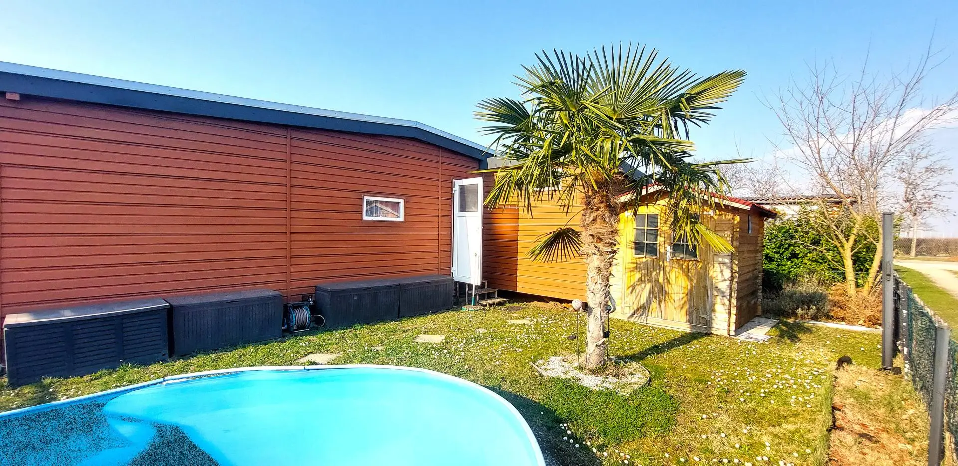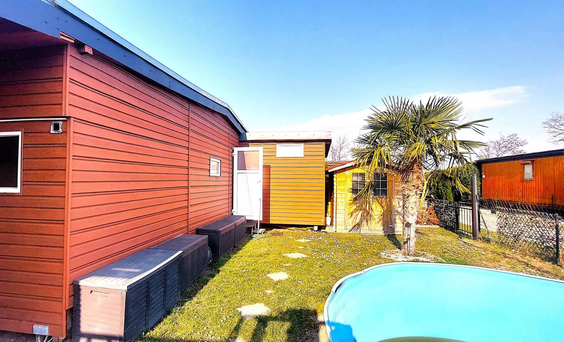 Das Wohnmobil mit einer Wohnfläche von ca. 42m² verfügt über ein Wohn-Esszimmer mit einer Küchenzeile, einem Schlafzimmer mit Doppelbett, ein Zimmer mit einem Einzelbett, einem Badezimmer mit Dusche und WC . Eine überdachte Terrasse sorgt für einen angenehmen Aufenthalt im Freien. Im Garten gibt es einen großen Pool und einen Geräteschuppen. Das Mobilheim steht auf einer Doppelparzelle mit ca 174m².