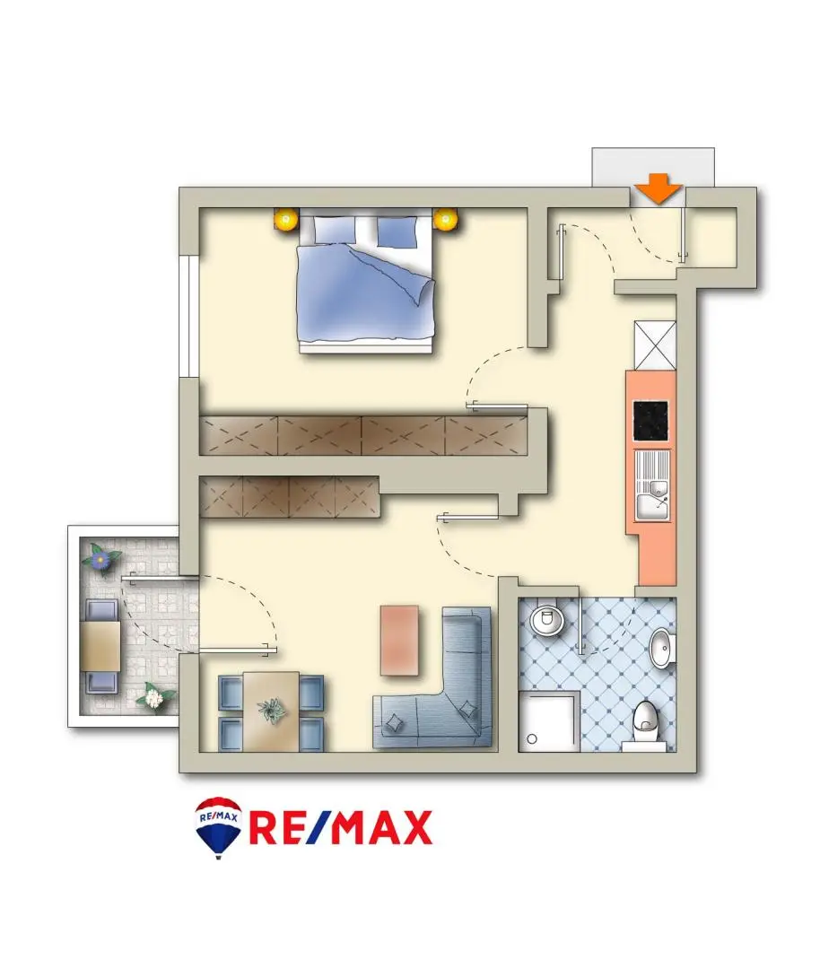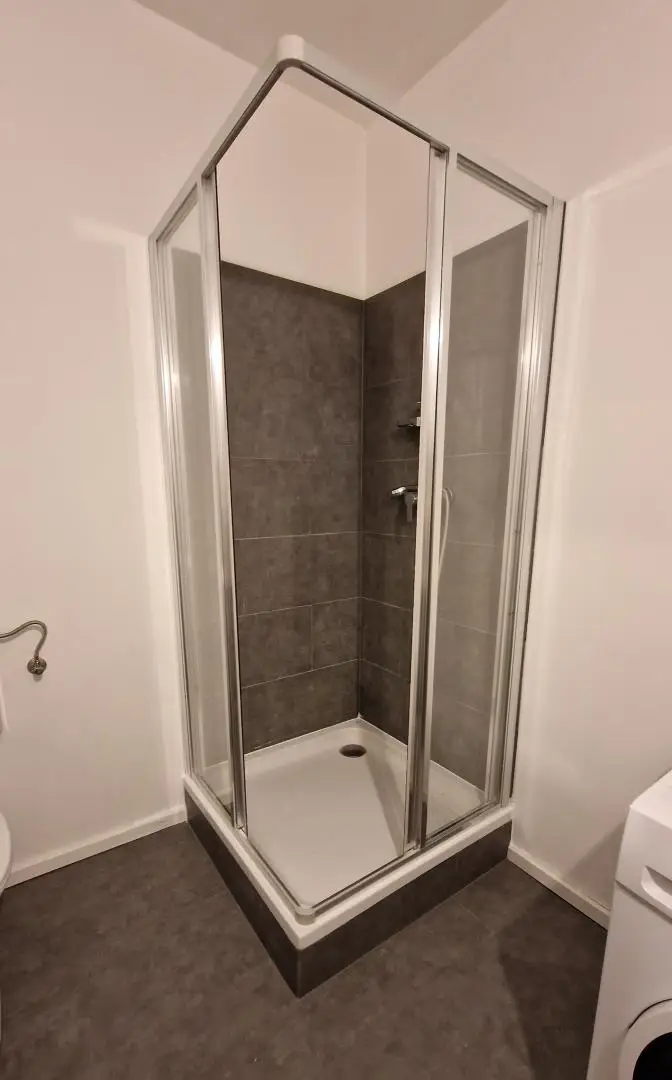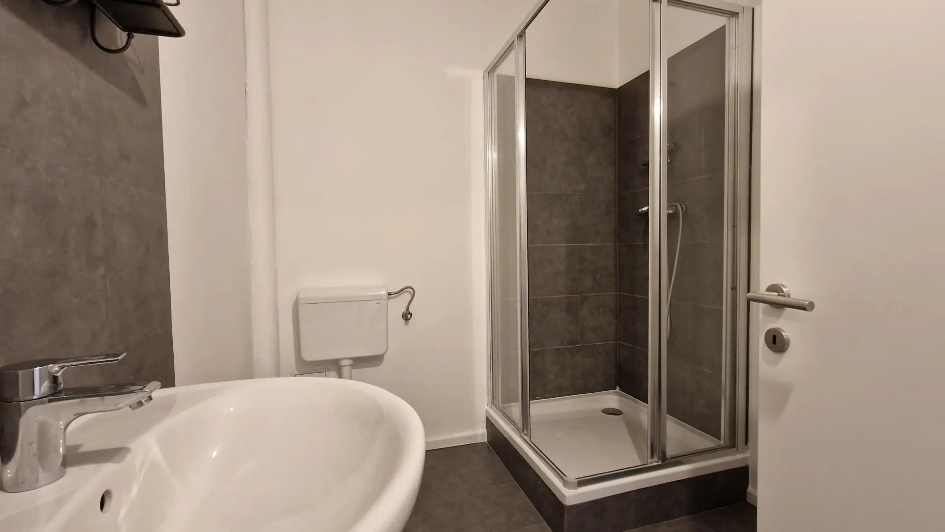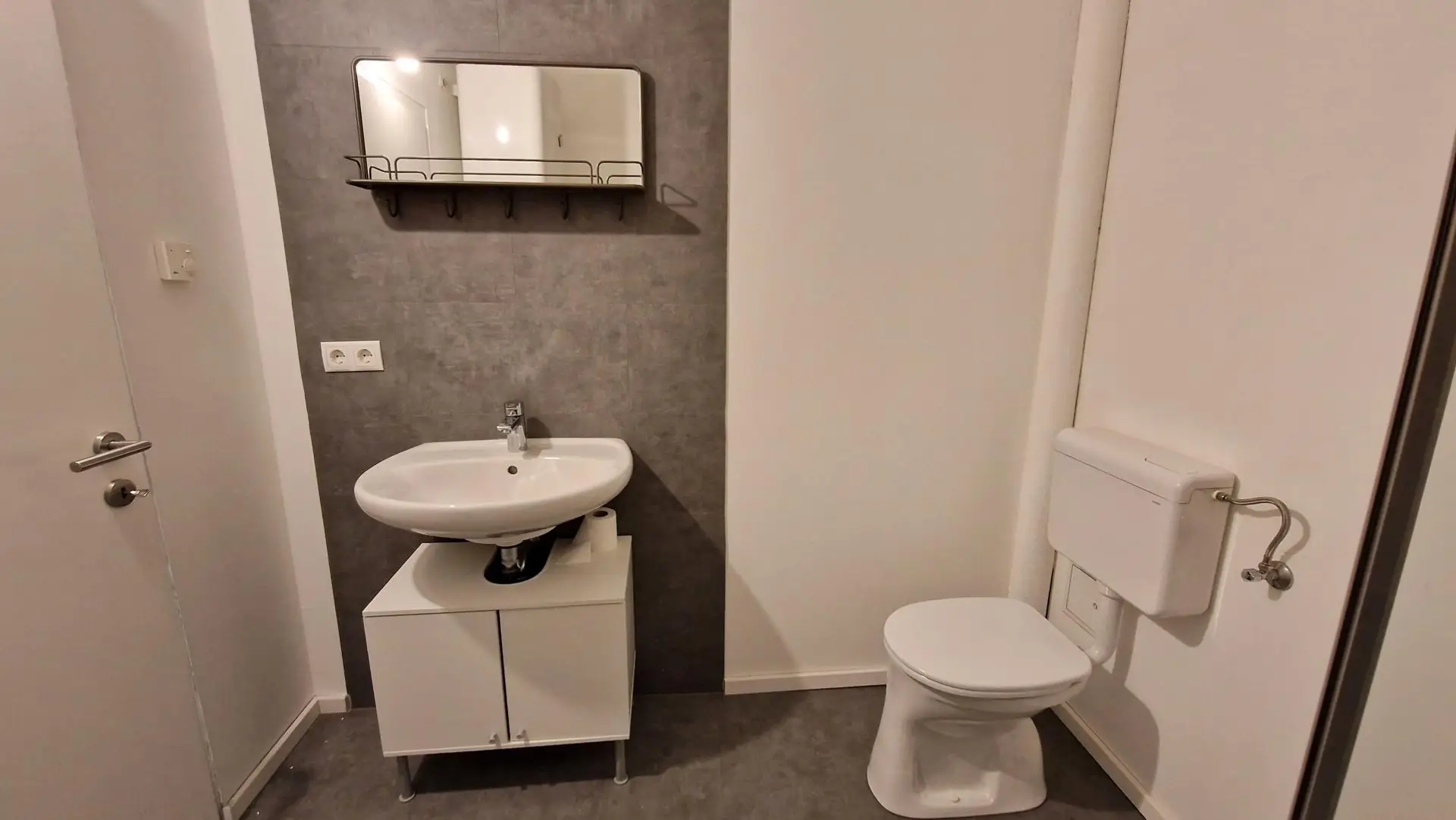 Das Badezimmer ist mit einer Dusche sowie einem Waschmaschinenanschluss ausgestattet, die Toilette ist ebenfalls im Badezimmer integriert. Beheizt wird die Wohnung mittels energieeffizienter Infrarotpaneele, während die Warmwasseraufbereitung über einen Boiler erfolgt.