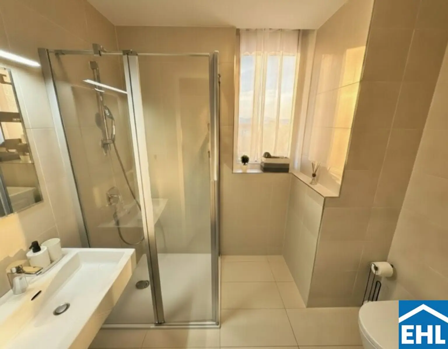 * Badezimmer mit Dusche, Toilette und Waschmaschinenanschluss