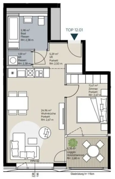 Die Wohnung besteht aus 2 Zimmern, mit knapp 49m² Wohnfläche sowie einer eigenen Loggia mit ca. 6m² und gliedert sich in folgende, funktionelle Raumaufteilung: