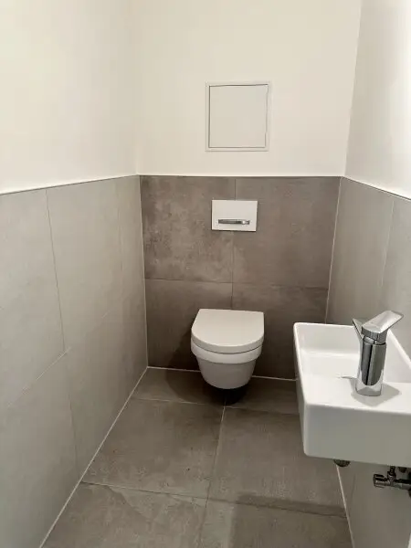 -) Badezimmer: Waschbecken Villeroy & Boch Memento, Armaturen Hans Grohe, Sprossenradiator mit E-Patrone als Handtuchtrockner