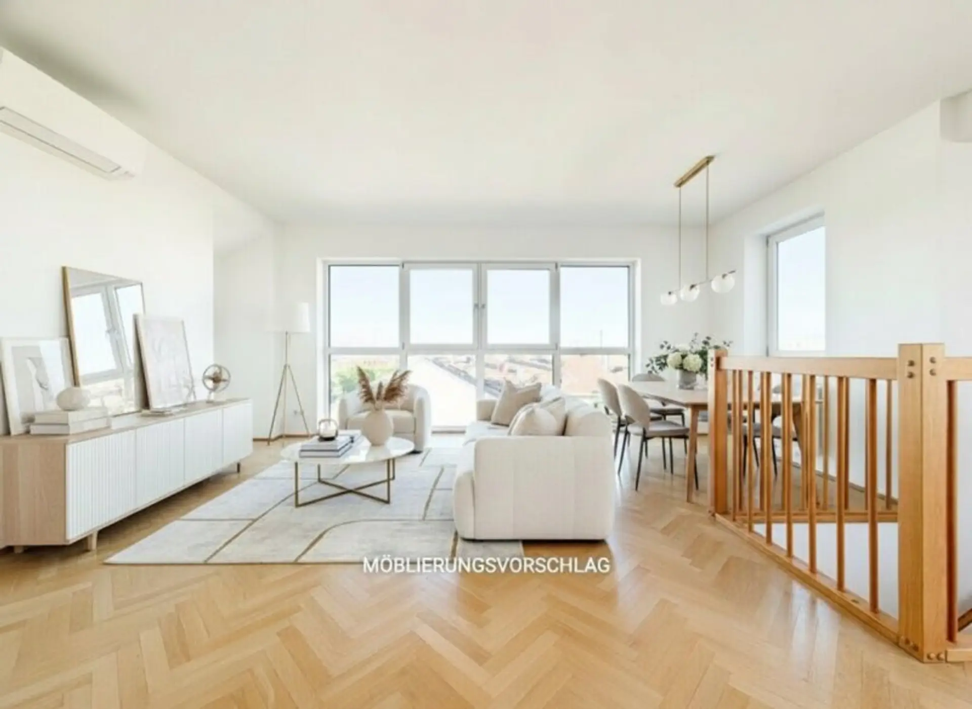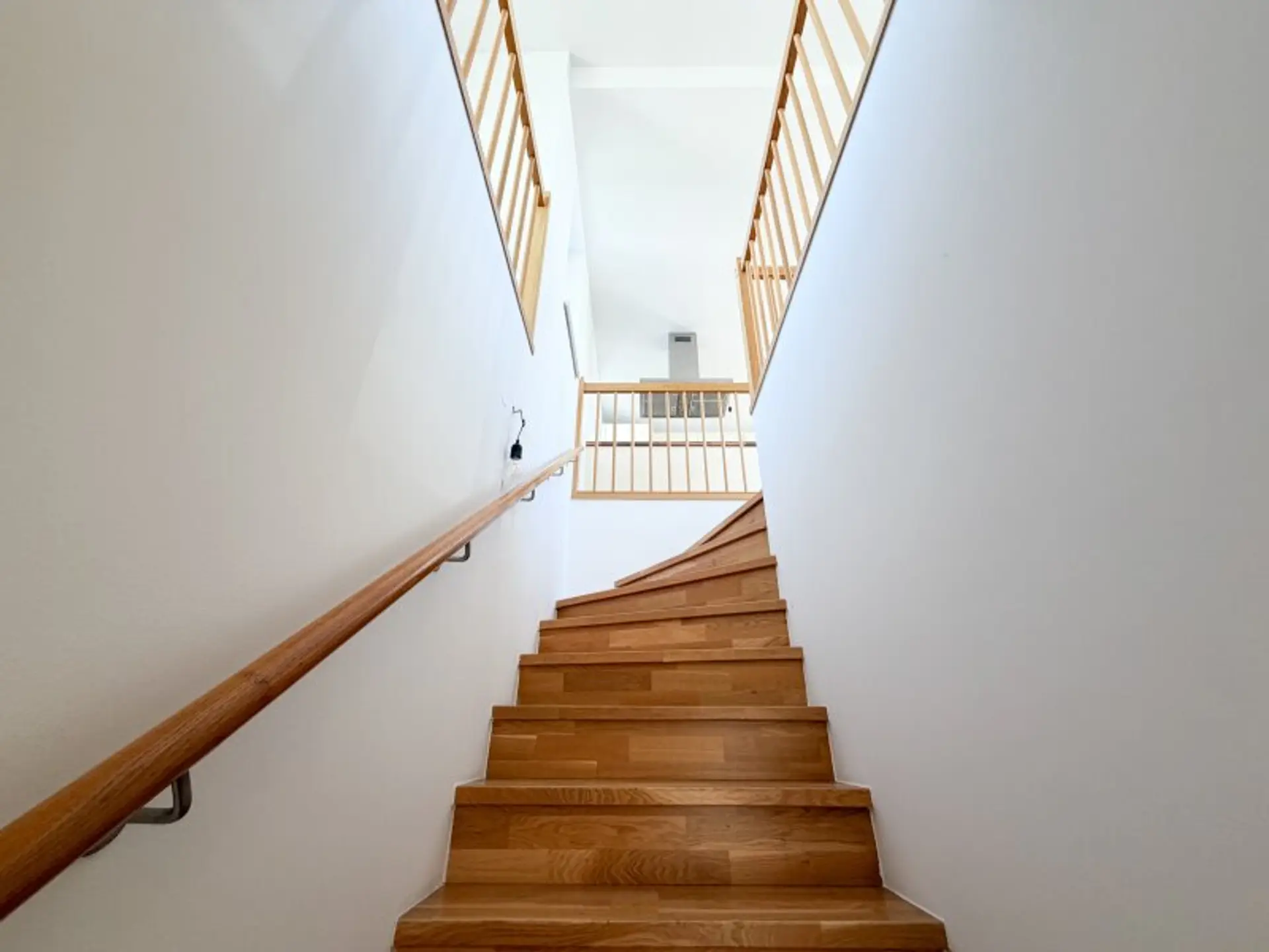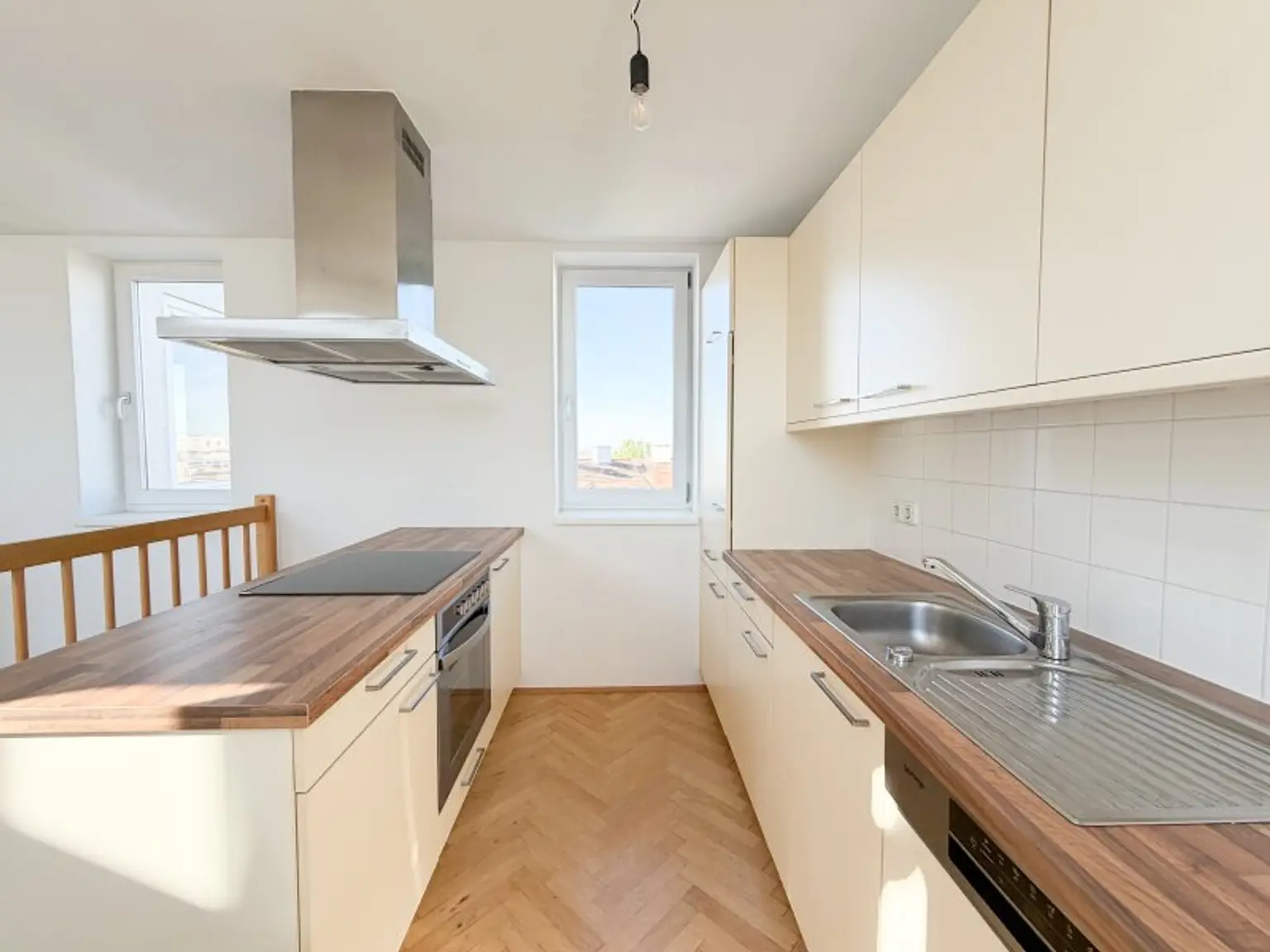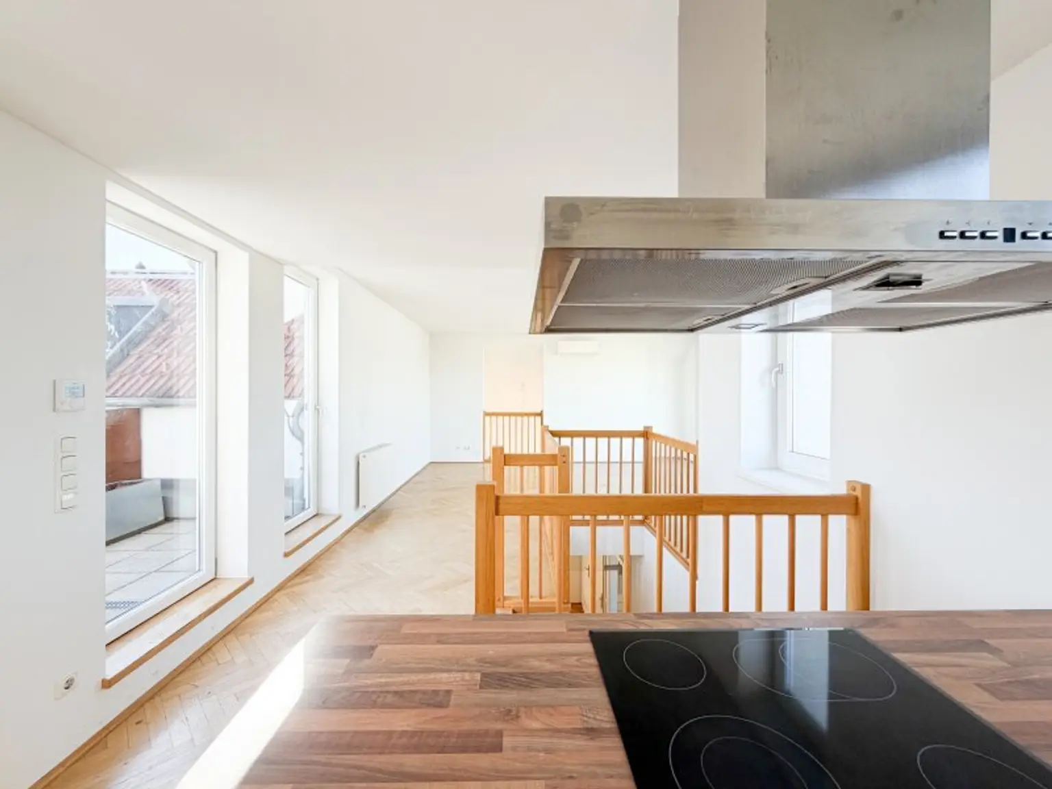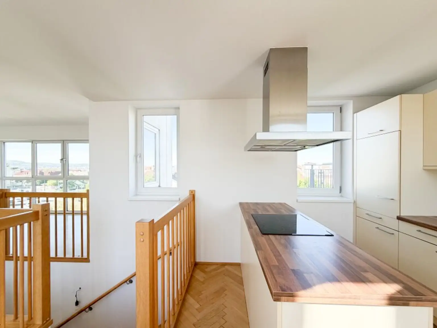 Über eine charmante Holztreppe gelangt man in die weitläufige Wohnküche – ein zentraler Treffpunkt mit viel Raum für Alltag und besondere Momente. Die Kombination aus offenen Flächen, Dachschrägen und großen Fensterfronten sorgt für ein Wohnambiente, das sich angenehm von klassischen Grundrissen abhebt.