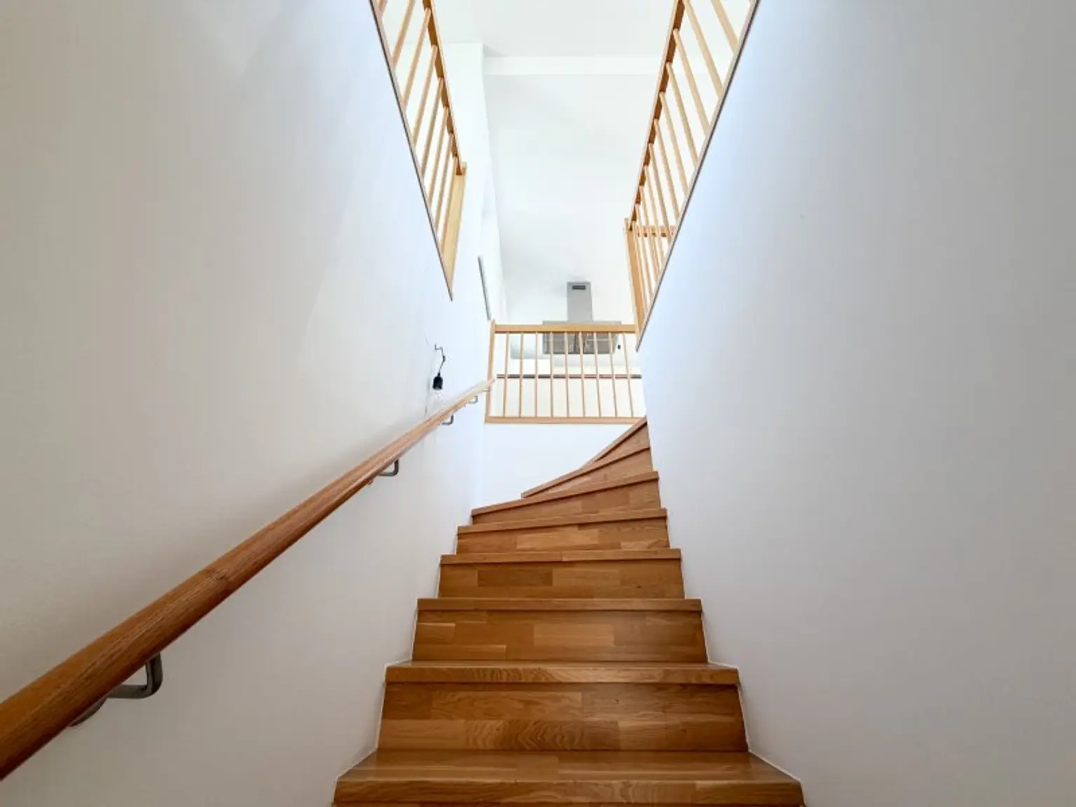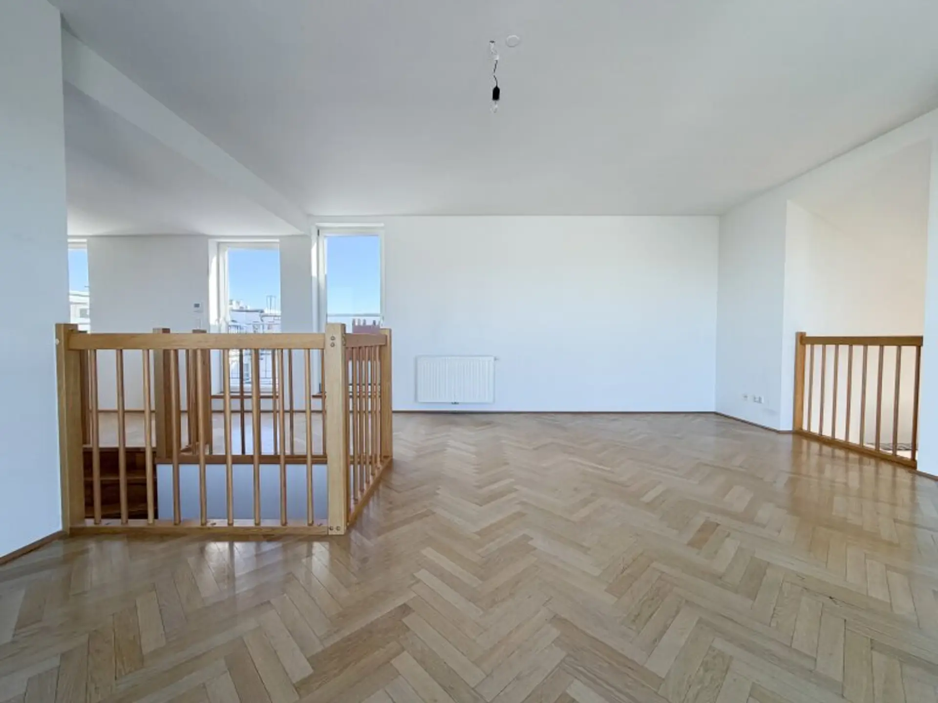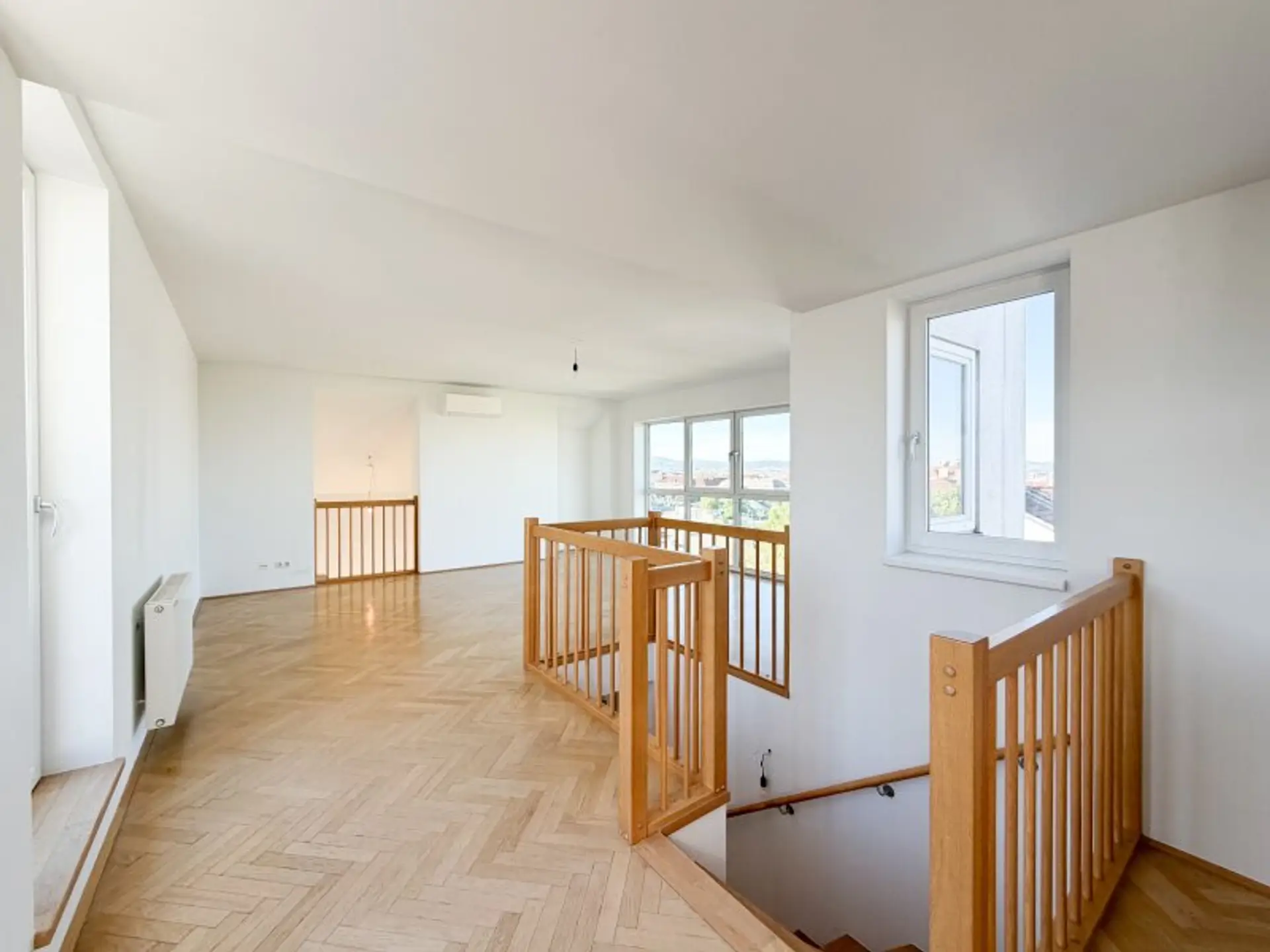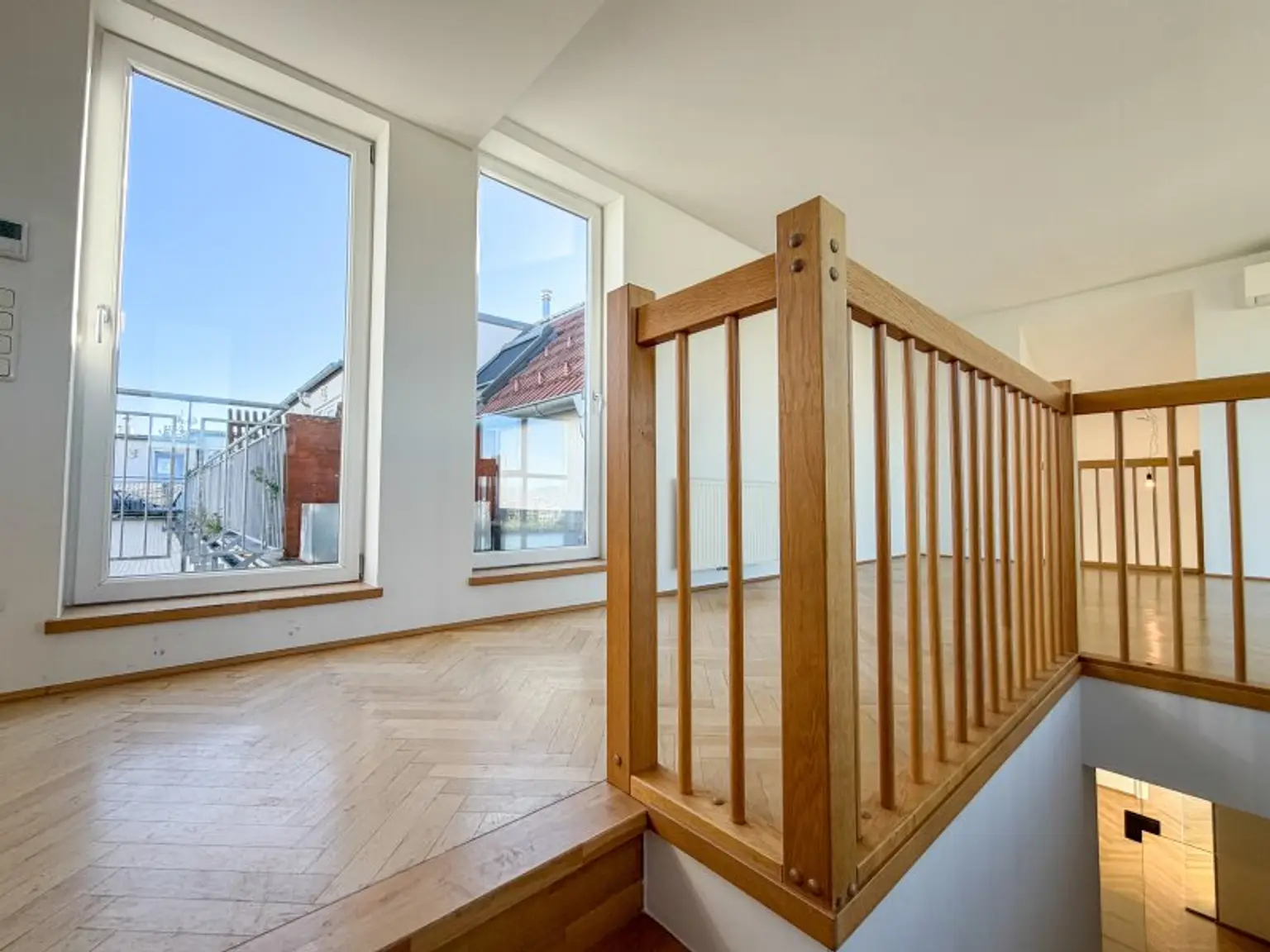 Die Wohnung erstreckt sich über zwei Ebenen und überzeugt durch ihre luftige Gestaltung. Besonders hervorzuheben sind die beiden Schlafzimmer im unteren Bereich: Die außergewöhnliche Raumhöhe verleiht diesen Räumen ein großzügiges, fast loftartiges Gefühl und schafft zusätzliche Möglichkeiten für individuelle Gestaltung.