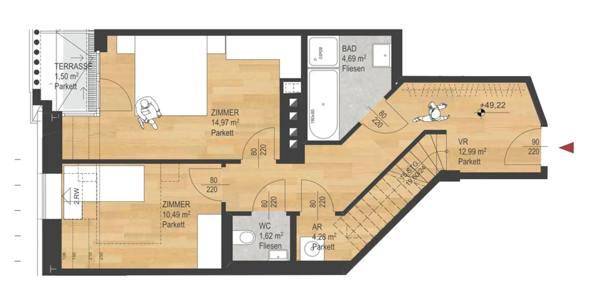 - hochwertige Echtholzparkettböden in Wohnräumen (Eiche)
