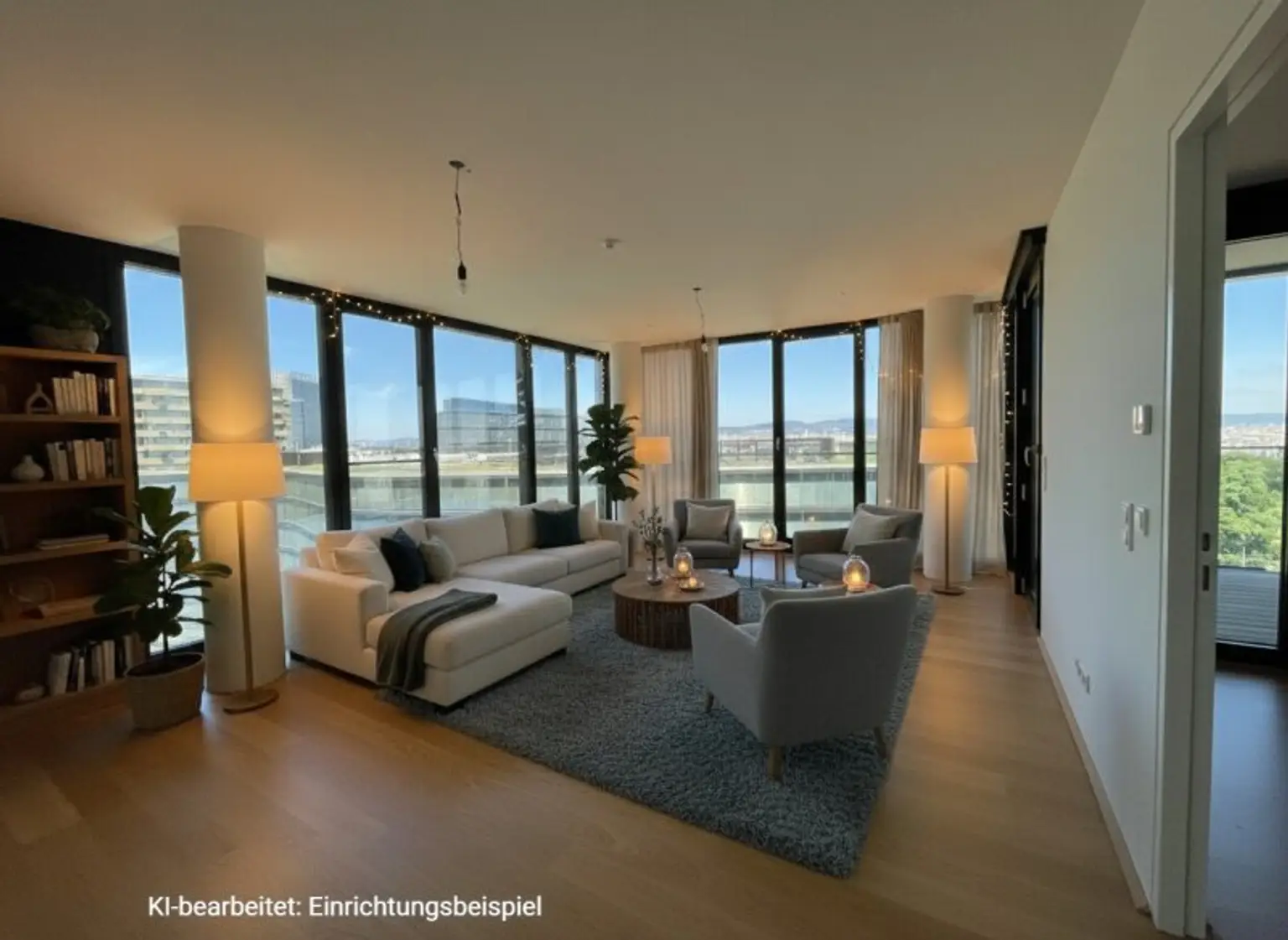 Dies sind (teilweise) keine Originalbilder! Die Fotos stammen von neben ähnlichen Wohnungen aus dem selben Gebäude und dienen daher als gute Veranschaulichung und bieten gleichzeitig die Möglichkeit zum Vergleich. Aufteilung der Wohnung gemäß Grundrissplan; der Ausblick ist aufgrund der Stockwerkslage nicht allzu hoch gelegen.