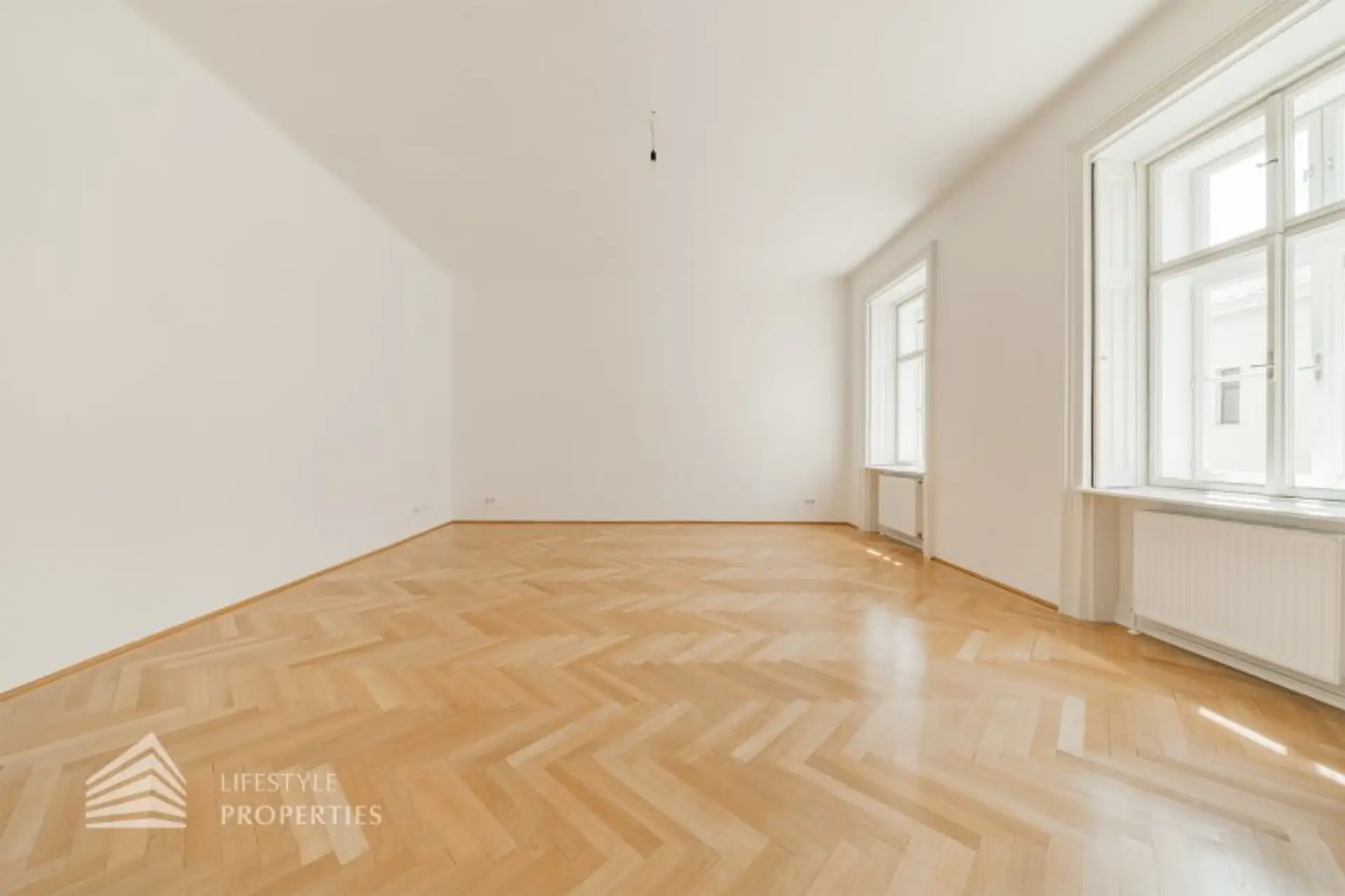 Das zweite Zimmer, hat eine Fläche von ca. 49,60 m² und ist somit der größte Raum dieser Immobilie. Der schöne Boden ist mit qualitativ hochwertigen Parkett verlegt. Die Wände sind im stilvollen Weiß gehalten. Die hohen Decken verleihen den Räumlichkeiten ein elegantes Flair. Durch die großen Fenster dringt viel Tageslicht in den Raum und repräsentiert sich hell und freundlich.