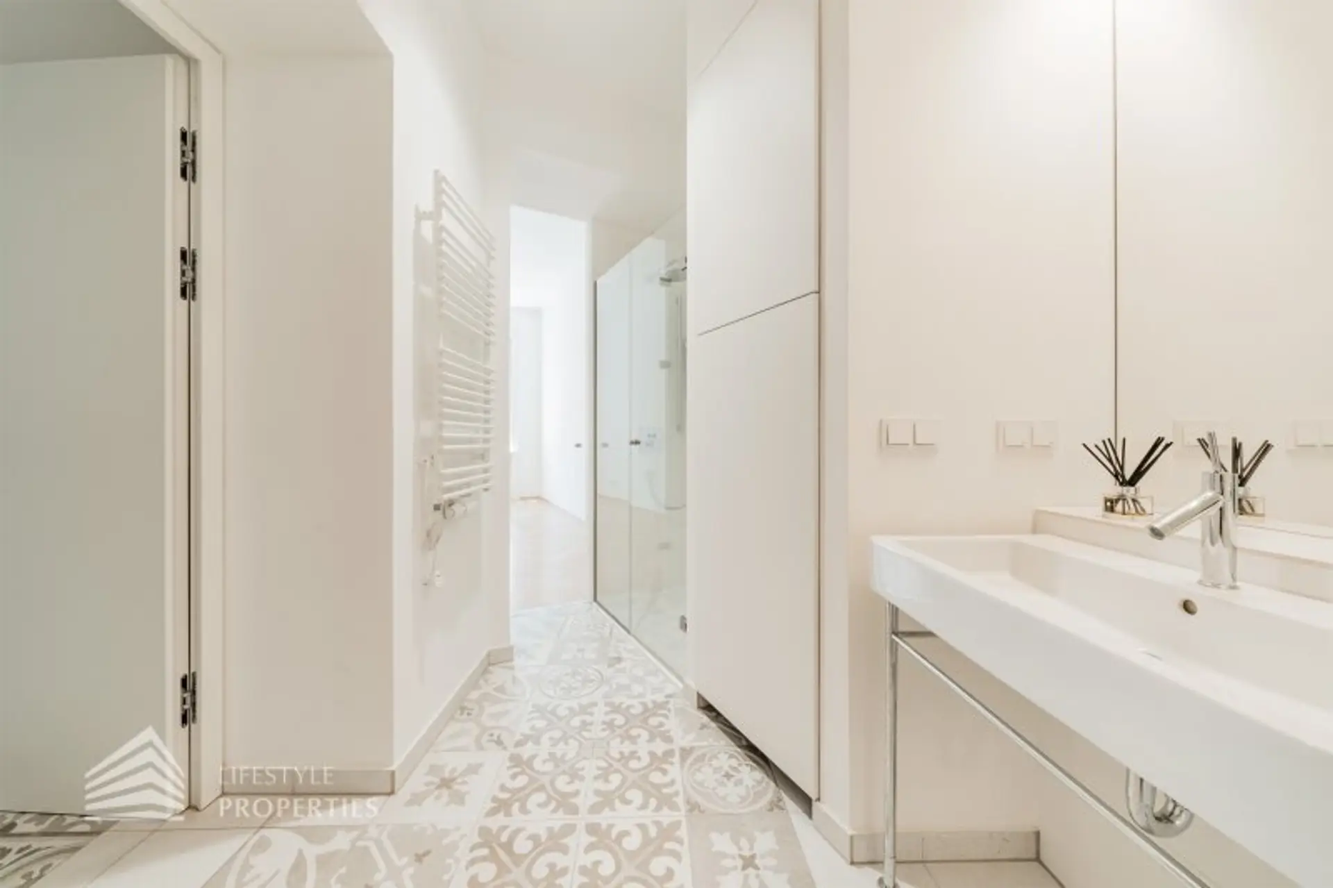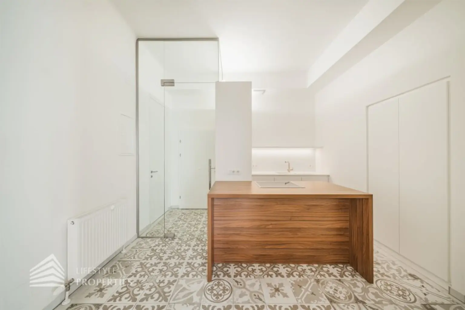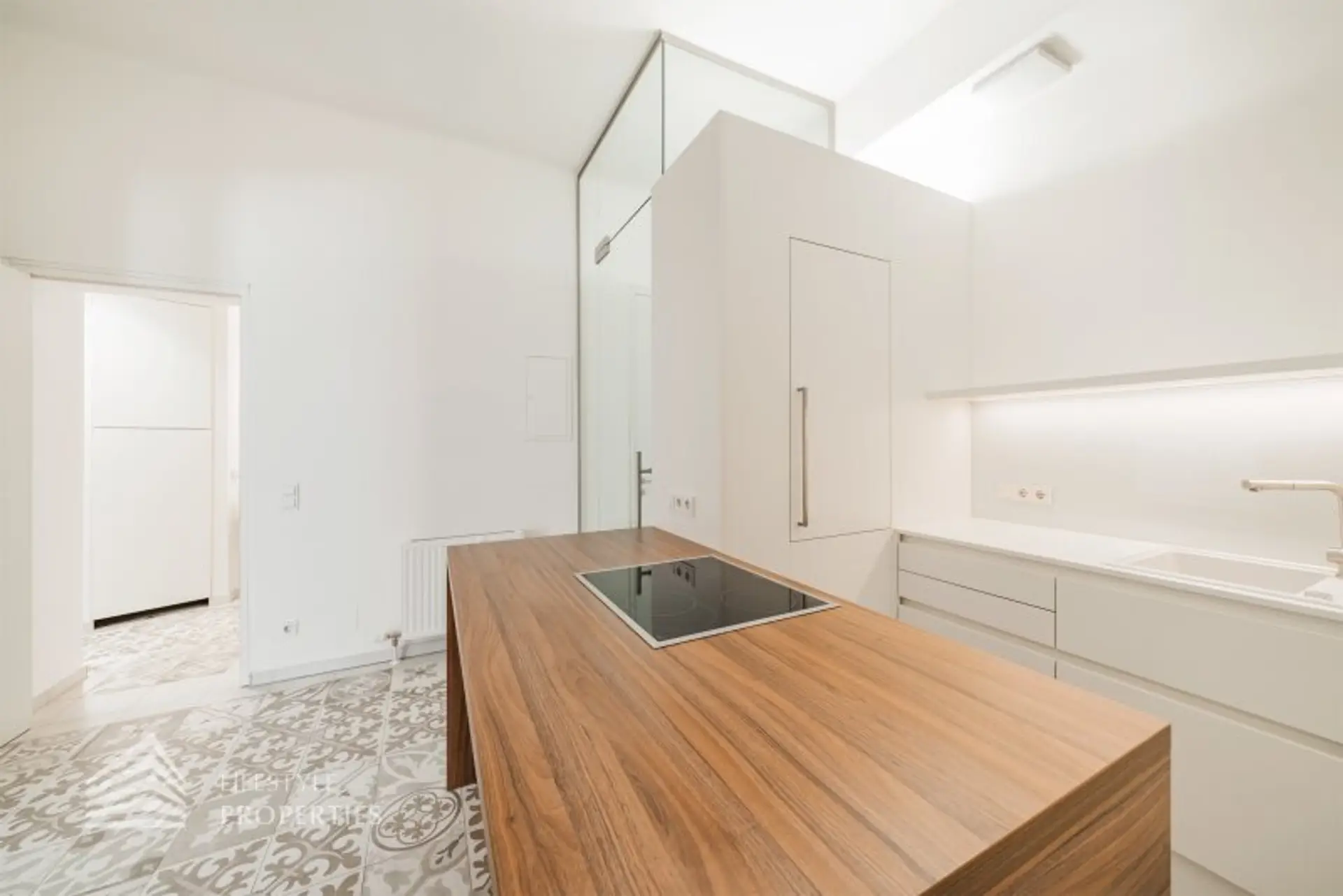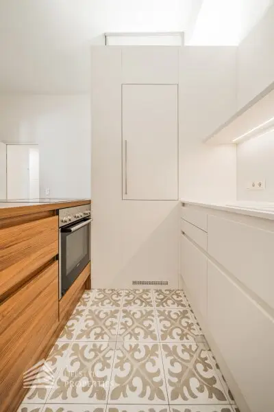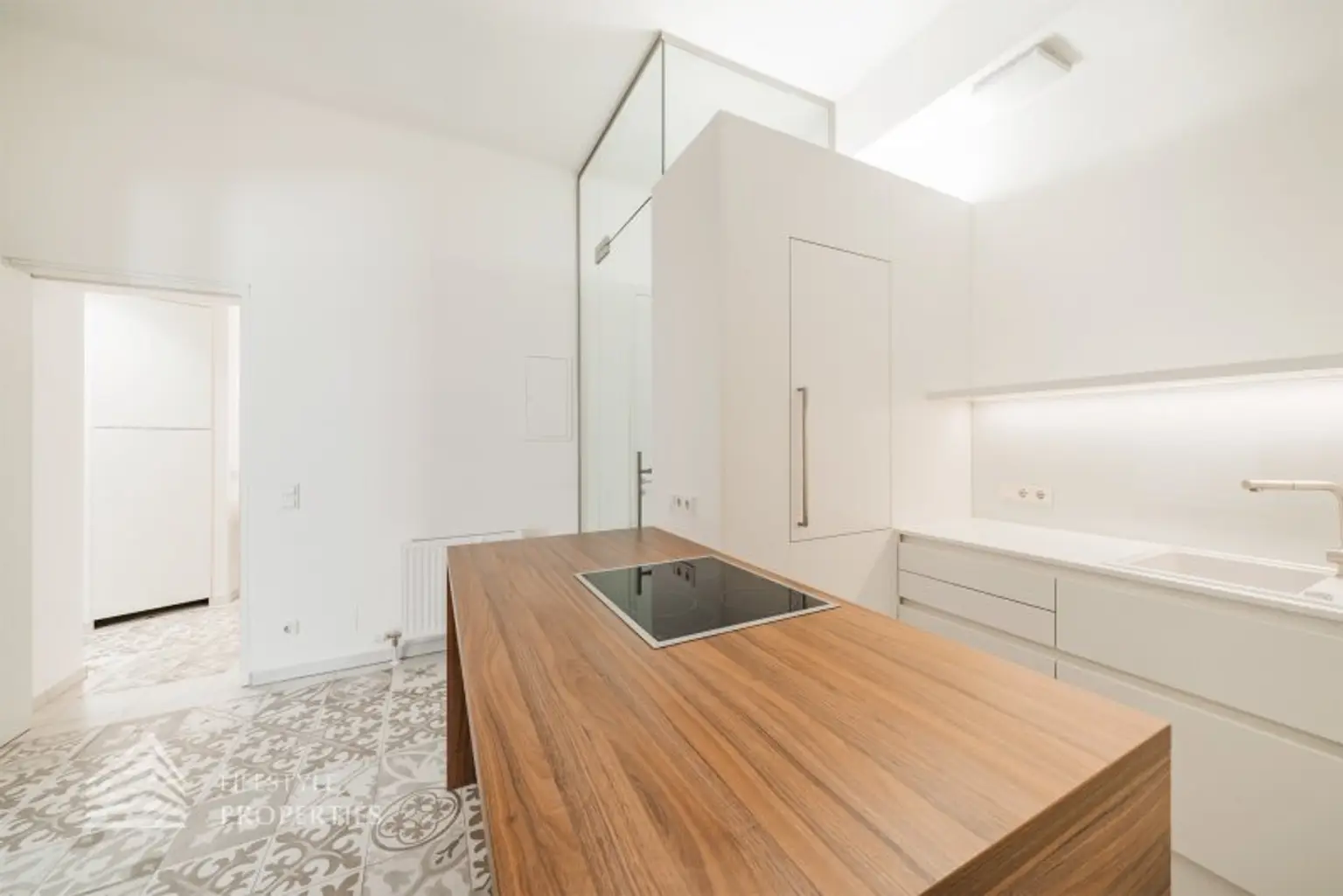 Der Küchenbereich ist direkt vom Vorraum zu erreichen. Die Küche ist sehr modern und stilvoll gestaltet. Die helle Küche wird durch den Boden geschmackvoll hervorgehoben und bildet einen schönen Akzent zu der weißen Räumlichkeit. Ein Kühlschrank, Herd, Kochplatte, und Dunstabzug sind bereits vorhanden. Hänge- und Unterschränke sorgen für den benötigten Stauraum im Küchenbereich.