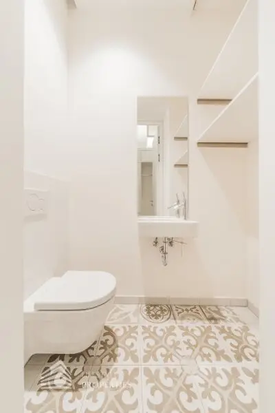 Der Vorraum erstreckt sich über eine Fläche von ca. 2,5 m². Rechter Hand vom Vorraum befindet sich die separate Toilette und das ca. 8,88 m² große Badezimmer. Das Bad ist mit einem Waschbecken, einer Badewanne und einer Toilette ausgestattet. Das verflieste Badezimmer ist mit geschmackvollen, weißen Fliesen gestaltet. Der graue Boden bildet einen schönen Akzent und verleiht dem Raum einen modernen Touch.