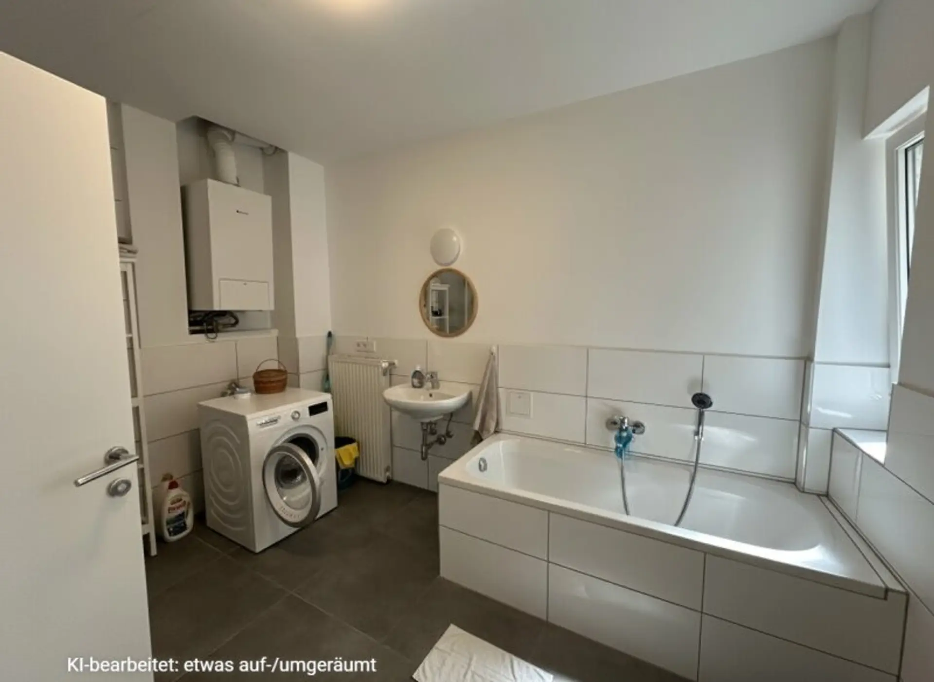 Beim Betreten werden Sie von einem einladenden Flur begrüßt, der rechterhand zu einem separaten WC mit Handwaschbecken führt. Nur wenige Schritte weiter, ebenfalls auf der rechten Seite, befindet sich das geräumige Badezimmer mit einer großzügigen Badewanne, einer Dusche, einem stilvollen Waschbecken, einem weiteren WC und einem praktischen Waschmaschinenanschluss.