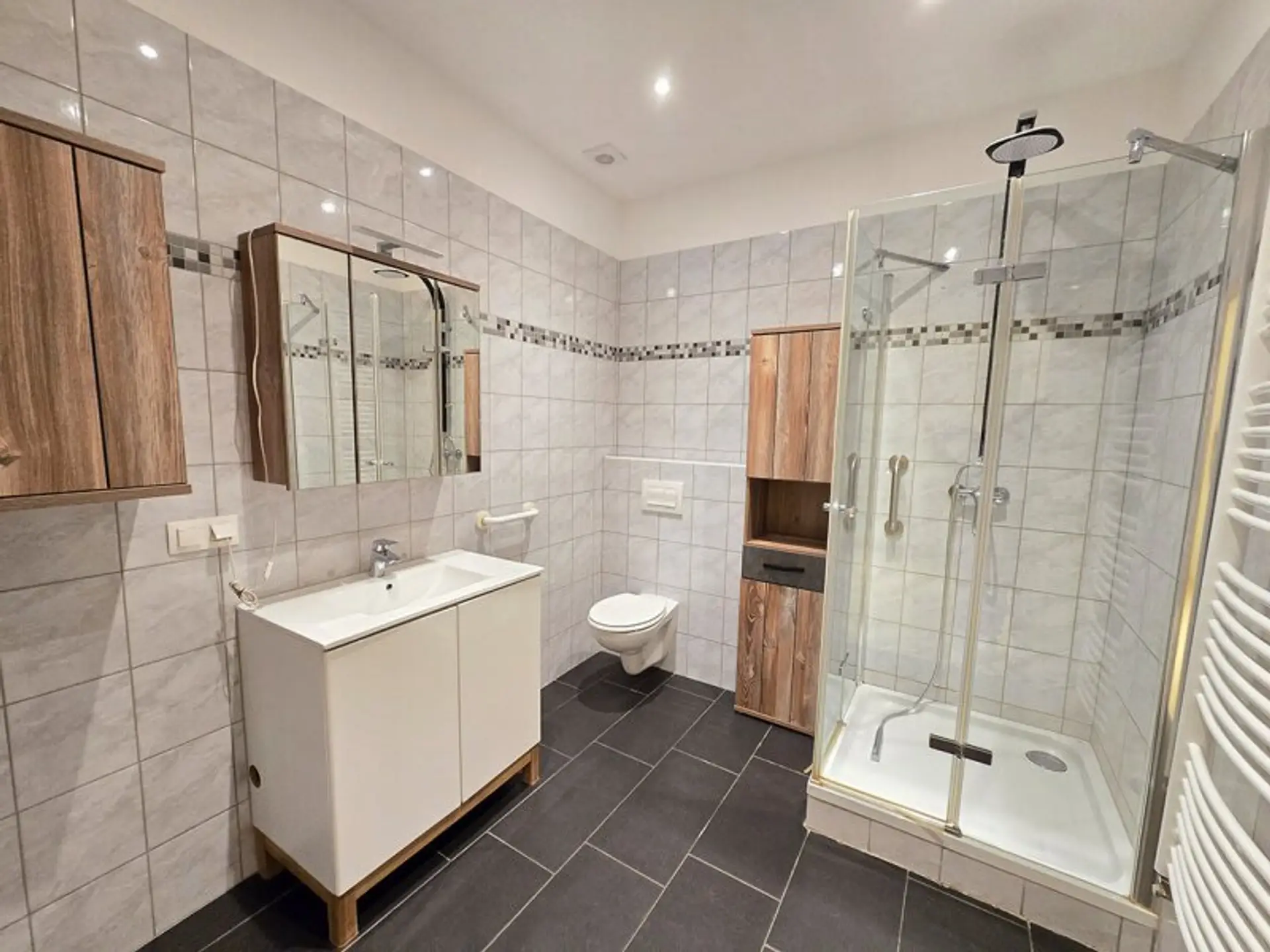 - Badezimmer mit Dusche, Waschbecken, WC, Handtuchheizkörper und Waschmaschinenanschluss