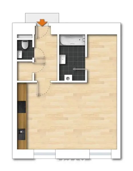 Bei der Schlafnische ist aktuell der Zugang zum Bad mit Wanne. Abstellraum und WC mit Handwaschbecken erreichen Sie über den Vorraum.