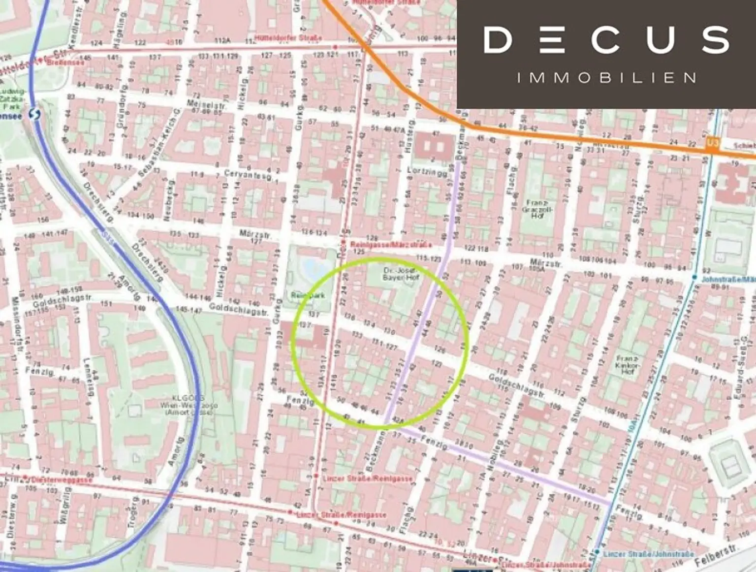 Die Liegenschaft ist im 14. Wiener Gemeindebezirk unmittelbar beim Reinlpark – sehr ruhig in einer Seitengasse gelegen. Zahlreiche Einkaufsmöglichkeiten und Lokale sowie Ärzte, Kindergärten und Schulen stehen im fußläufigen Umkreis zur Verfügung. Die Einkaufsstraße _Hütteldorfer Straße _ist rd. 300m entfernt und bietet alles für den Tagesbedarf. Auch die _Linzer Straße_ mit Supermarkt, Bäckereien etc. ist nur wenige Minuten entfernt.