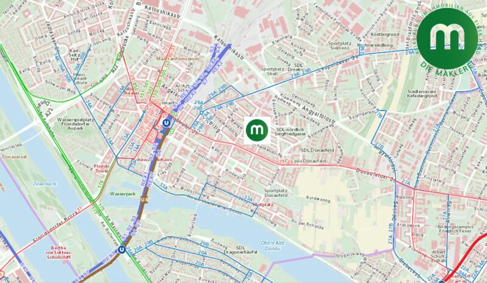 Nahversorger, Apotheken, Banken und Gastronomie befinden sich in direkter Umgebung. Das Schulzentrum Franklinstraße, der Campus Donaufeld, das Floridsdorfer Bad und die Alte Donau liegen nur einen Spaziergang entfernt.