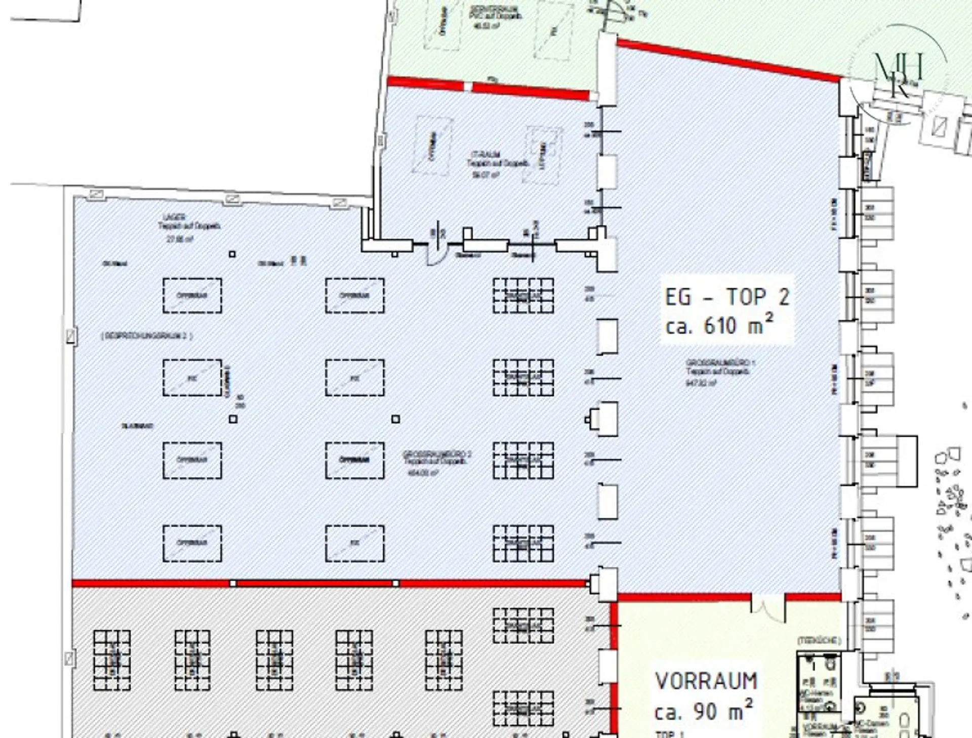 Die loftartige Bürofläche ist über einen Lastenaufzug sowie ein Stiegenhaus erschlossen. Derzeit besteht die Räumlichkeit aus einem Großraumbüro sowie Besprechungs-, Server-, und Lagerräumen und bietet ca. 716 m2 Nutzfläche. Zudem ist die Fläche mit einem Pausenraum inkl. Teeküche und getrennten Toiletten für Mitarbeiter und Kunden ausgestattet.