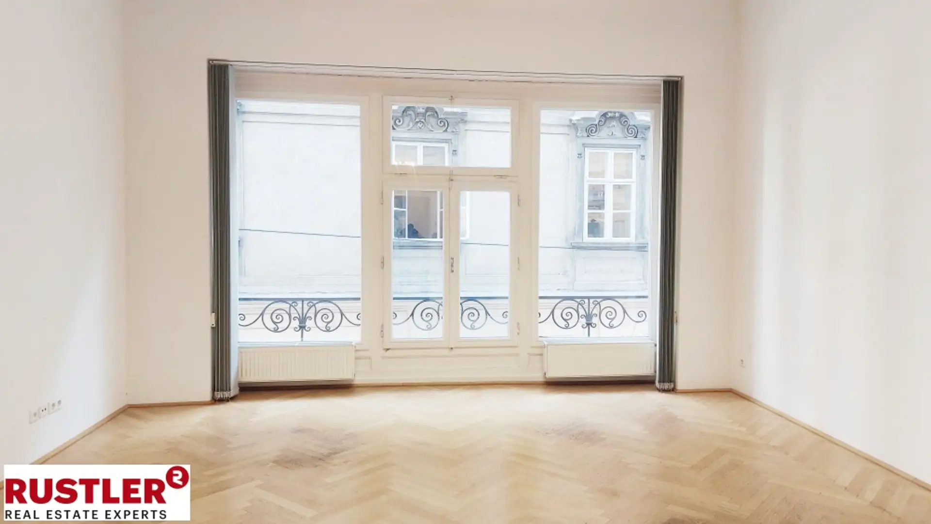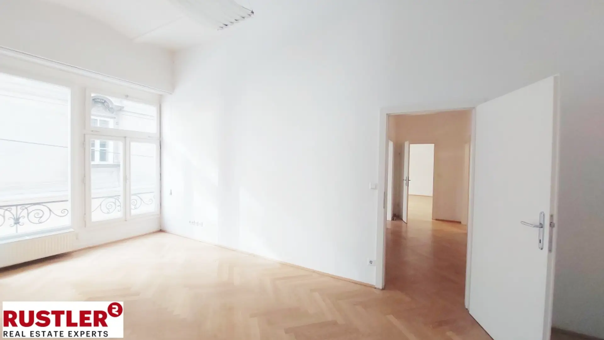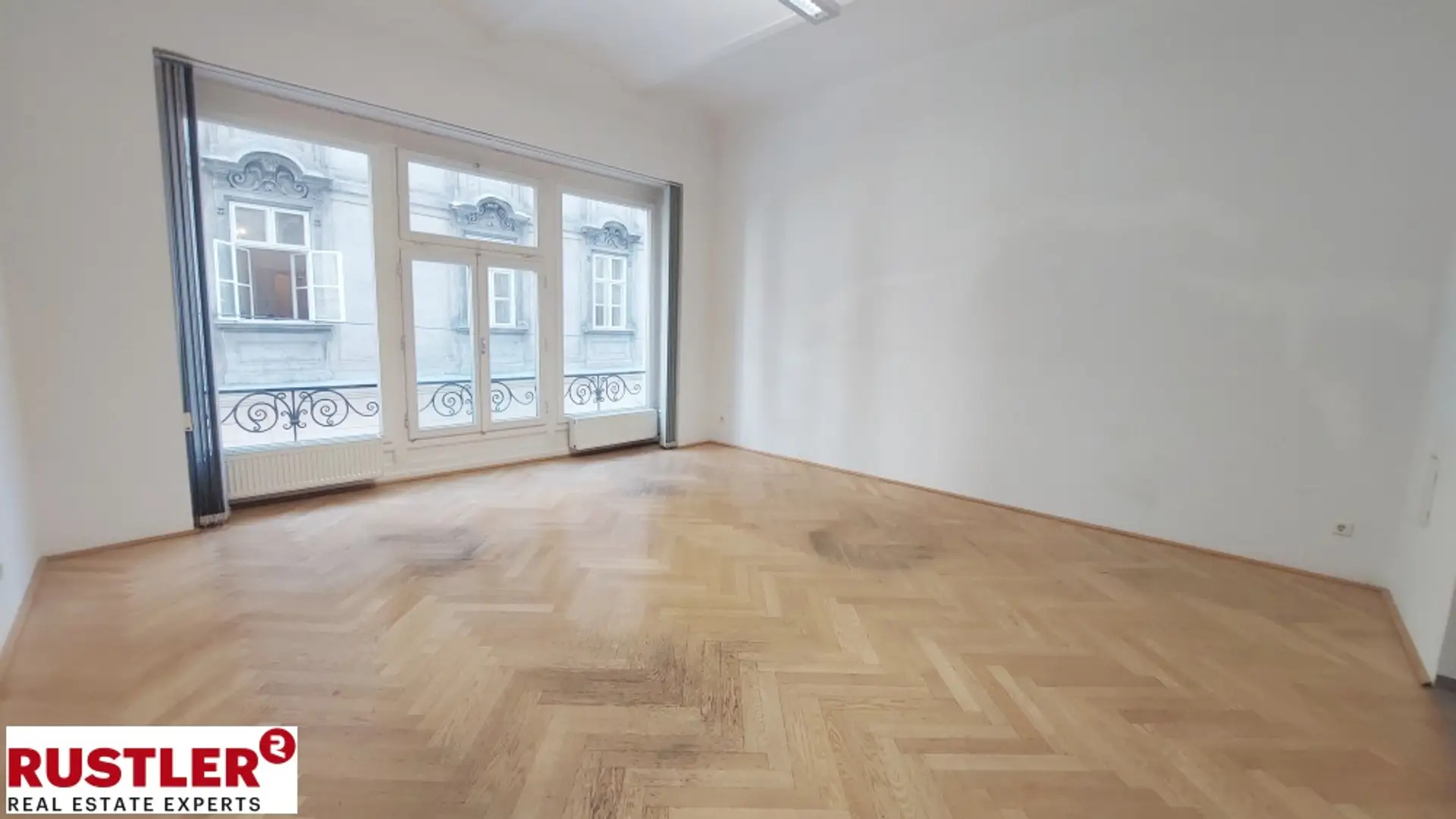 Die Bürofläche ist mit Fischgrätparkett versehen, die hohen Decken und die großzügigen, fast Bodentiefen Fenster schaffen eine helle und inspirierende Arbeitsumgebung.