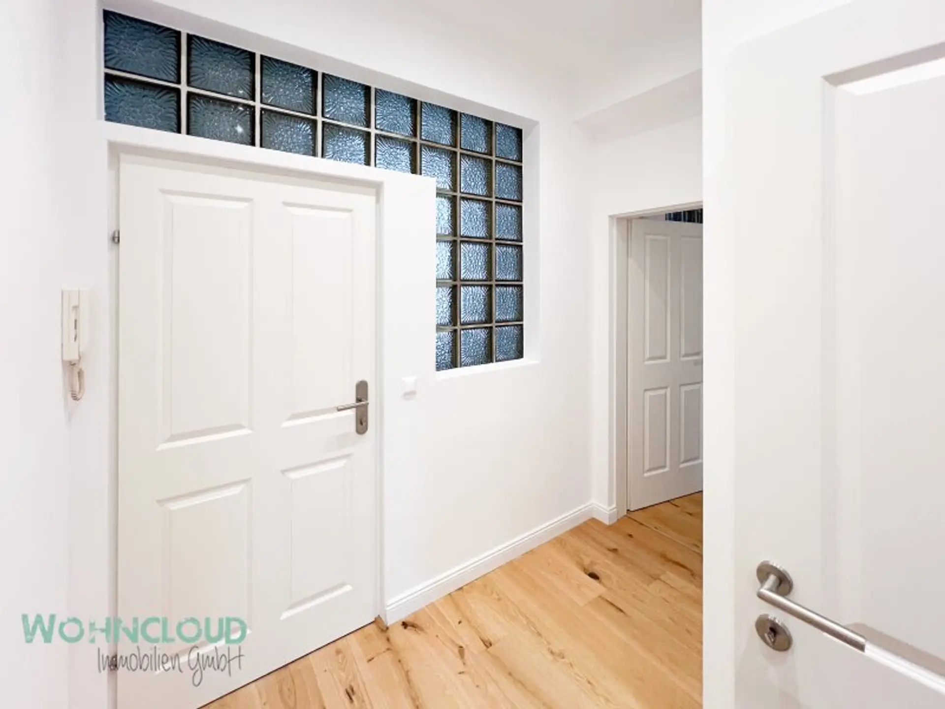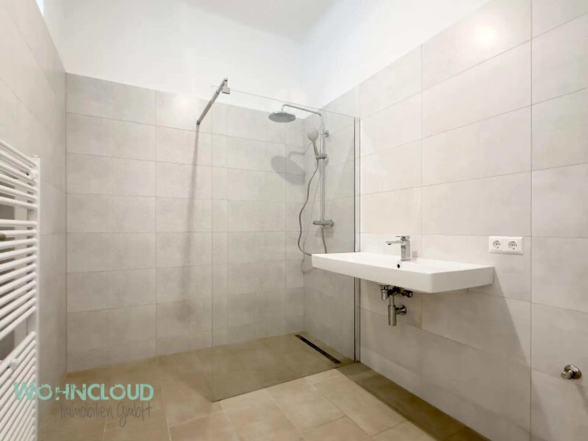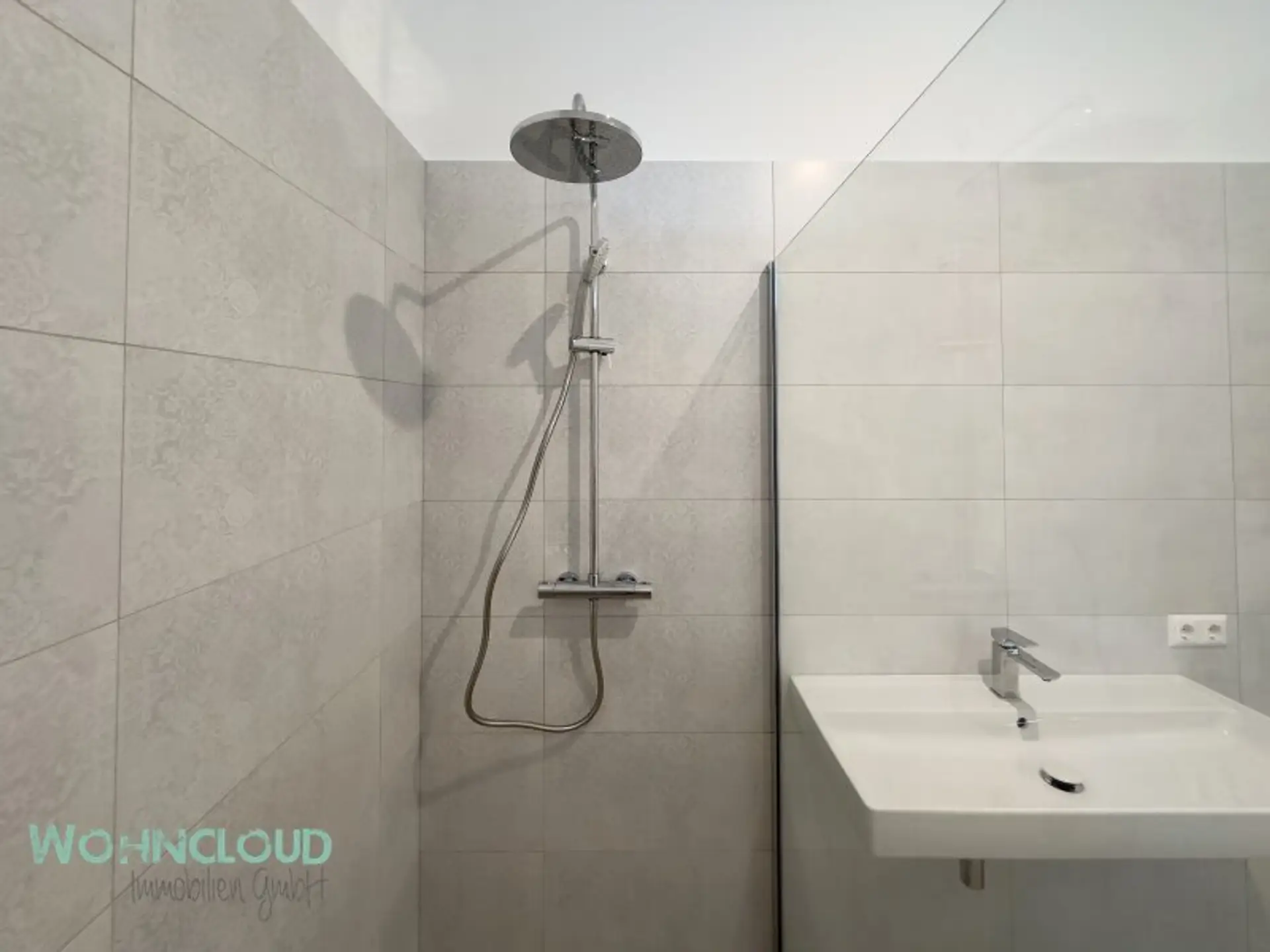 Kommen Sie hinein – gleich links geht es zur separaten Küche mit Durchgang zum gemütlichen und äußerst hellen Wohnzimmer. Von hier aus kommen Sie durch die Wohnzimmertür wieder zurück in den großzügigen Eingangsvorraum, mit Abstellraum für alles, was man so braucht – und daneben auch das WC. Gegenüber befindet sich das NEUE BAD – mit Regen- und Handdusche sowie einem großen Waschbecken. Hier können Sie sich im modernen Spiegel zurechtmachen und auch schon mal das Albrecht-Lächeln probieren. Die Zwischenwand von Bad und Schlafzimmer hat oben ein zusätzliches Glasfenster für mehr Tageslicht bekommen. Das sorgt für natürliches Licht im Spiegel – und dafür, dass Cremes und Pinsel den richtigen Weg finden. Klugerweise wurde auch ein Lichtfenster über dem Türrahmen zum Schlafzimmer eingebaut – auch das bringt mehr natürliches Südlicht in den Vorraum. Der Wohnungseingang liegt am äußeren Etagengang. Gut gewählte