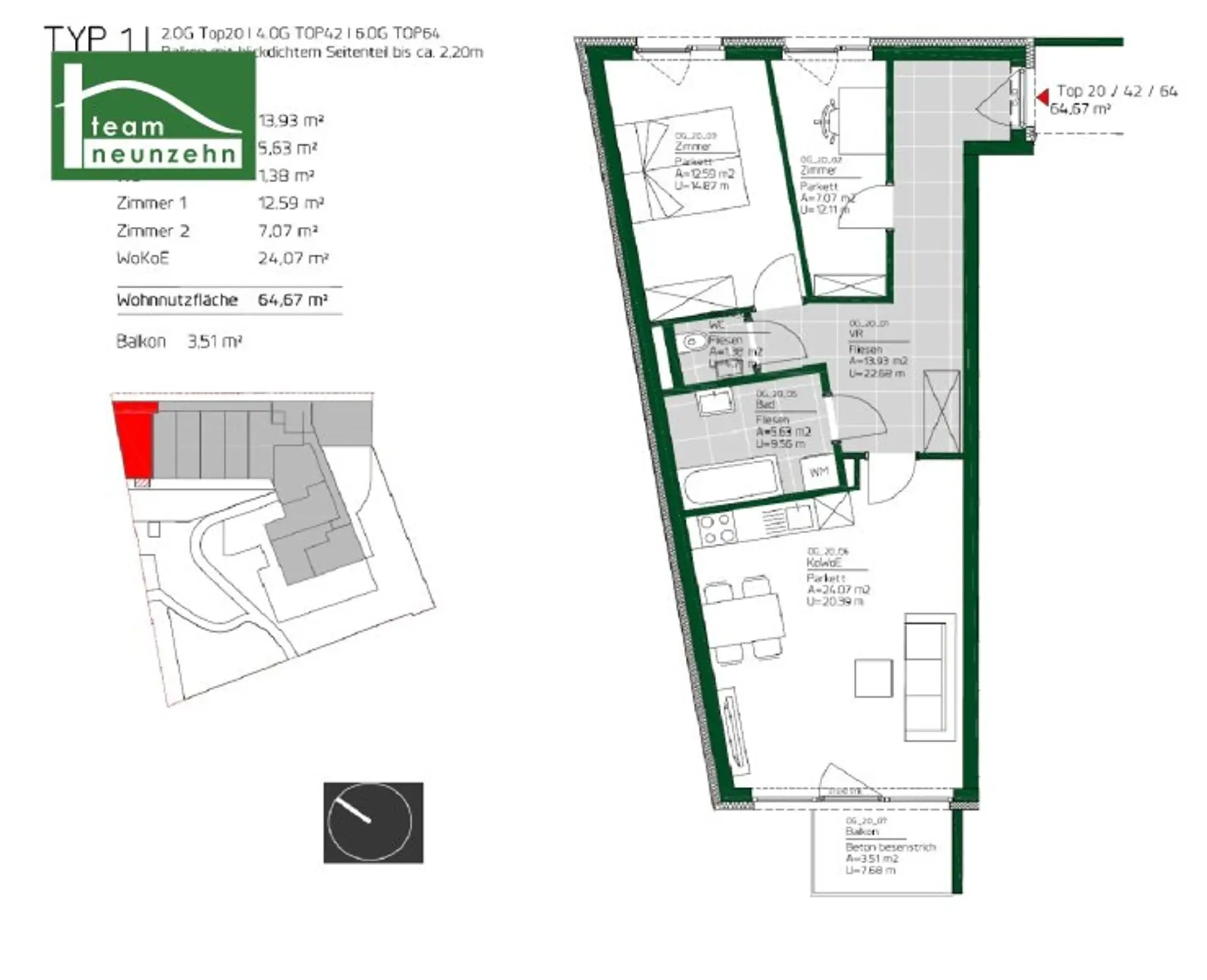 Die 3-Zimmer-Wohnung mit ca. 64,67 m² Wohnfläche zzgl. ca. 3,51 m² Balkon befindet sich 2. Obergeschoss und gliedert sich in folgende Raumaufteilung: