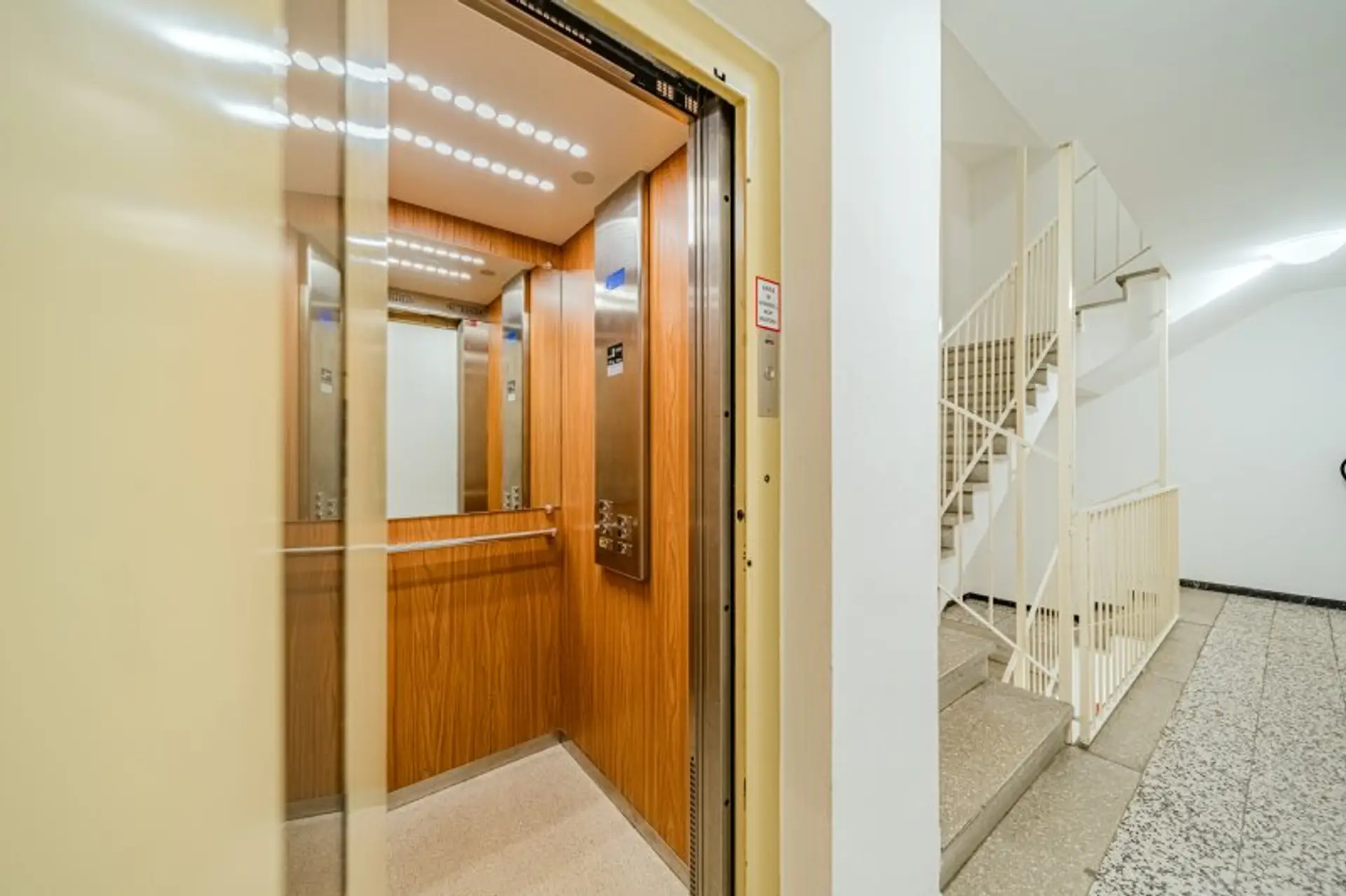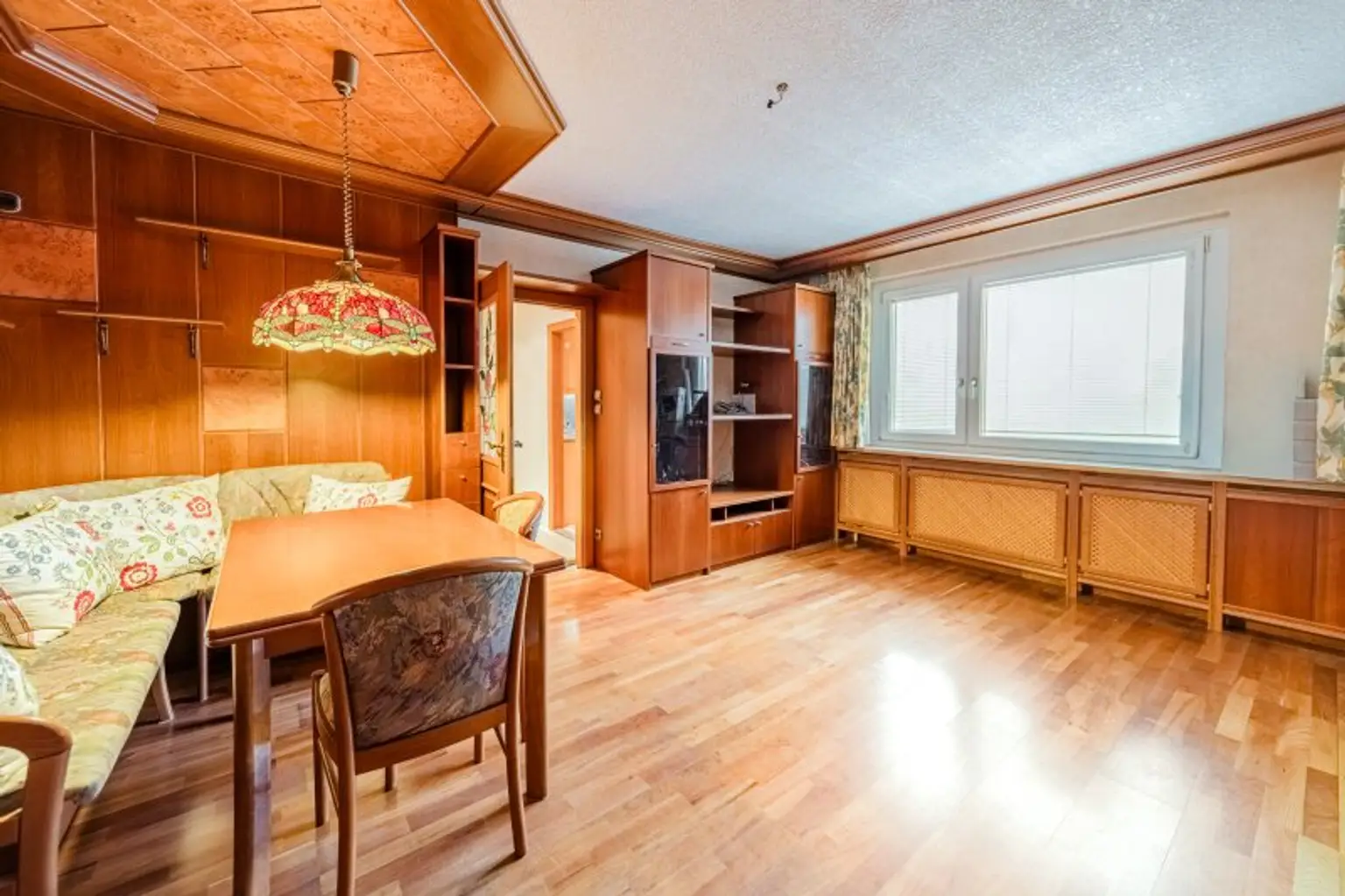 Die Wohnung liegt im ersten Stock und der Lift befindet sich direkt vor der Türe. Die Aufteilung ist zentral durch den Vorzimmerbereich. Das Herzstück ist das große geräumige Wohnzimmer. Derzeit prägen das Wohnzimmer Vertäfelungen an der Wand in dunklem Holz sowie Holzverbauten. Durch das Wohnzimmer führt ein geräumiger Schrankraum in die weiteren Zimmer. Beide Zimmer bieten Platz für ein Schlafzimmer und ein Kinder oder Arbeitszimmer. Im Vorzimmer sind WC und Bad getrennt. Das Badezimmer bietet eine Dusche und eine Badewanne. Besonderen Stauraum bietet der zusätzliche Abstellraum. Eine geräumige Küche rundet die Wohnung ab.