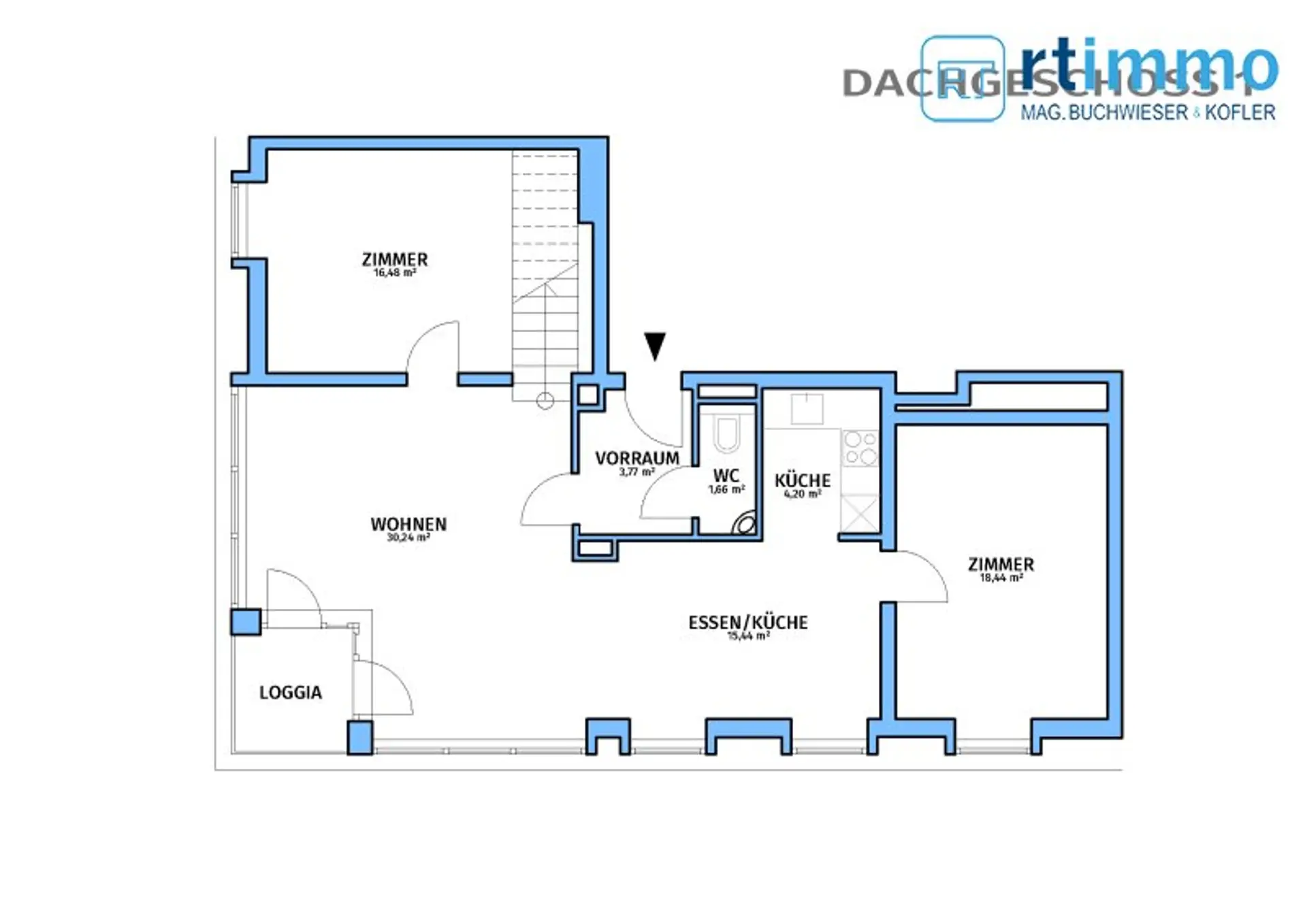 Wohnebene 1: Vorzimmer, Wohnesszimmer mit angeschlossenem offenen Küchenbereich und Loggia, Schlafzimmer, 1 Zimmer (derzeit Büro) WC, Abstellraum