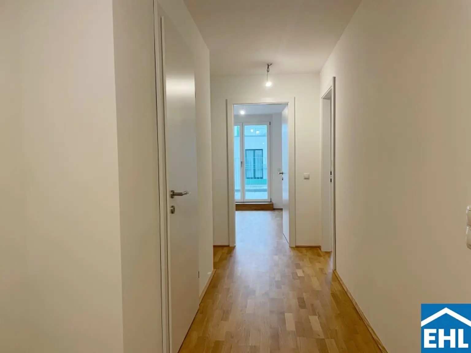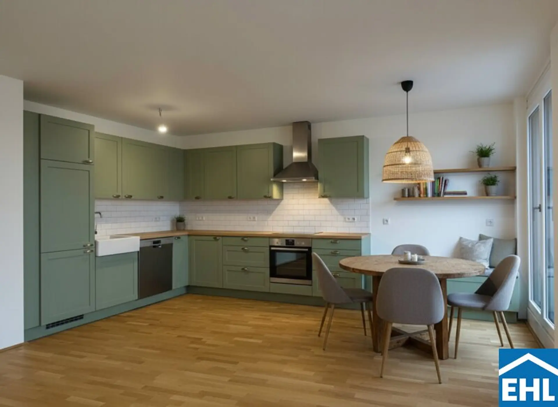 Eichenparkettböden, Holz-Alu-Fenster und Außenjalousien schaffen ein stilvolles Ambiente mit natürlicher Wärme. Dank Smart-Home-Vorbereitung, Fußbodenheizung und Raumkühlung über Bauteilaktivierung genießen Bewohnerinnen und Bewohner ein ausgewogenes Wohnklima zu jeder Jahreszeit.
