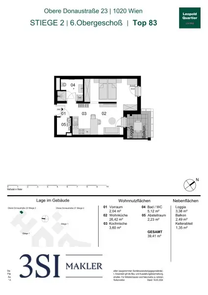 Diese moderne Wohnung befindet sich im 6. Obergeschoß. Die Einheit verfügt über eine Wohnnutzfläche von insgesamt 39,41 m² und bietet zusätzlich eine ca. 3,38 m² große Loggia und einen 2,49 m² großen Balkon.