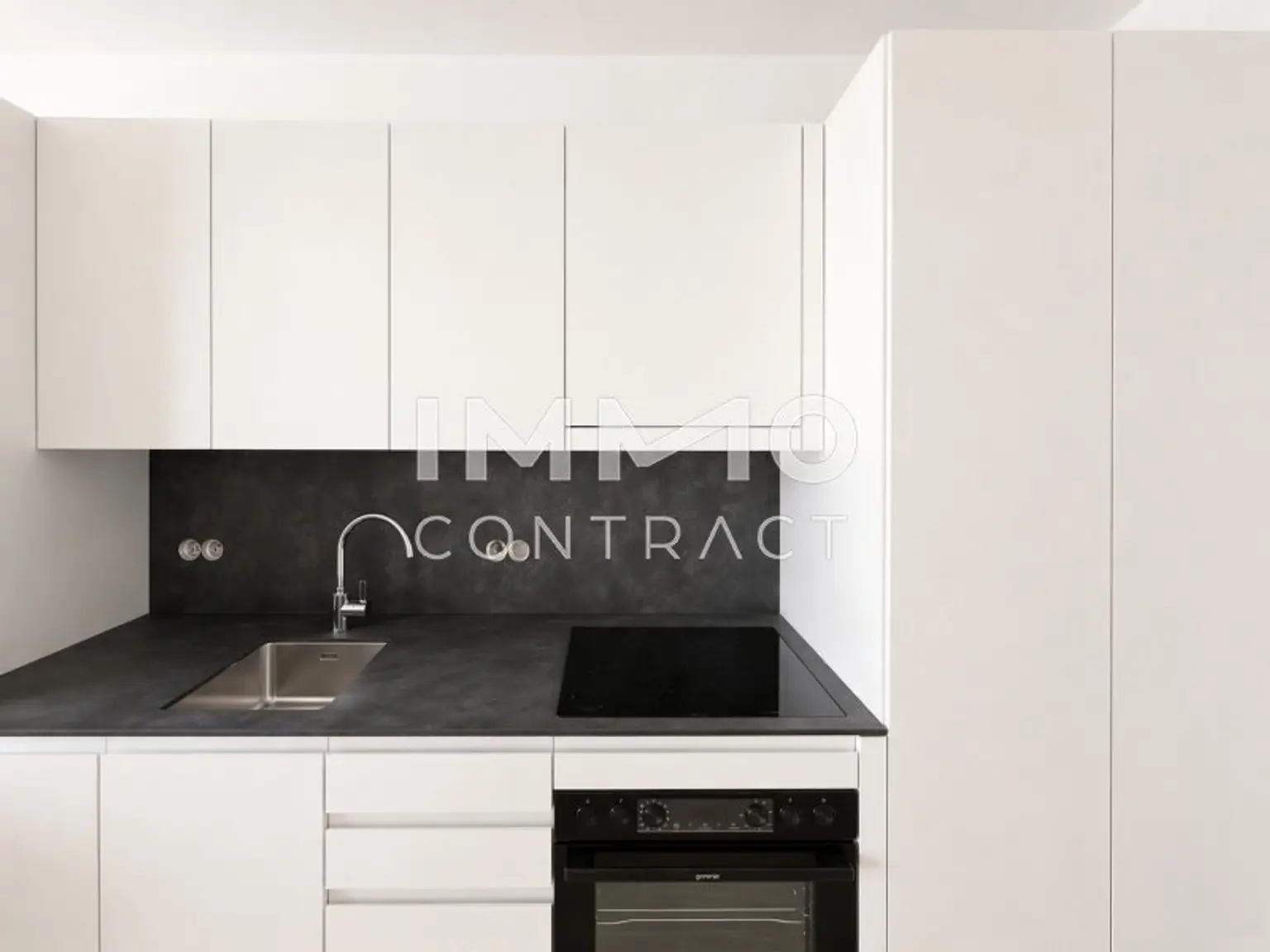 Die voll ausgestattete Küchenzeile ist dezent in den Raum integriert und bietet alles, was man für den urbanen Alltag benötigt. Große Fensterfronten holen die Stadt in die Wohnung und schaffen ein außergewöhnliches Raumgefühl.