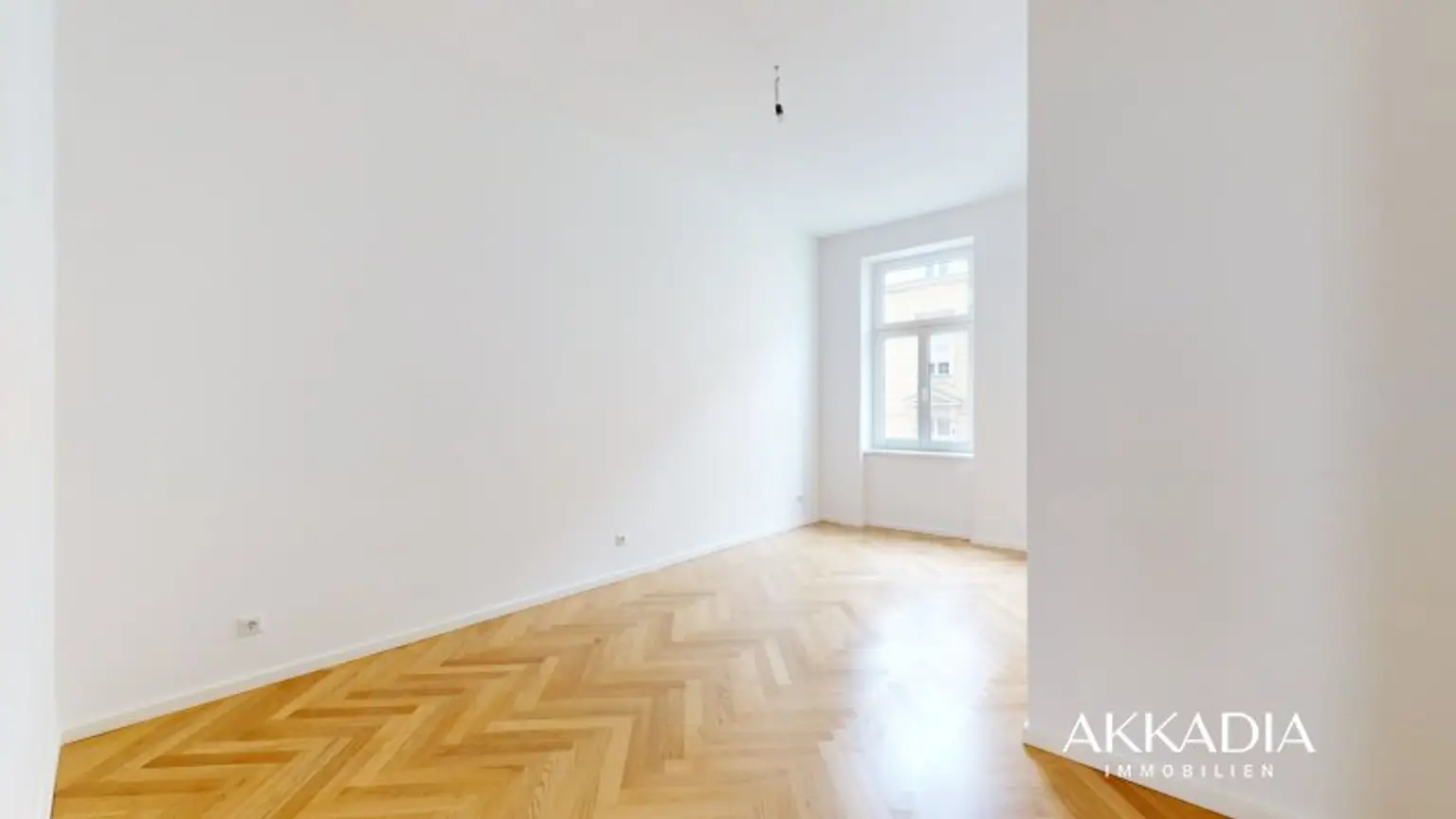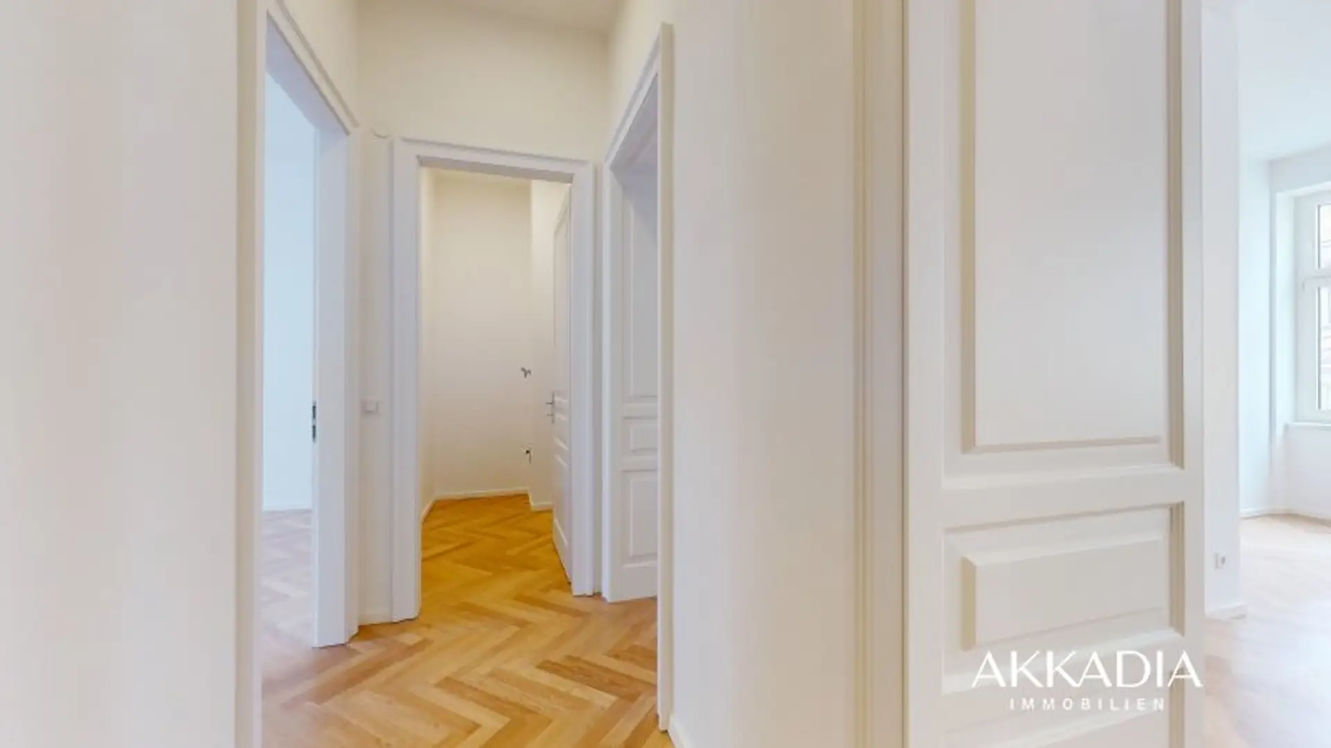 Die Wohnung befindet sich im 1. Stock und hat eine Wohnfläche von ca. 83 m². Die Wohnung verfügt über einen Vorraum mit Abstellraum, eine Wohnküche, ein separates WC und Badezimmer sowie zwei Schlafzimmer. Vom hofseitigen Schlafzimmer aus hat man Zugang zu einem Balkon, der sich vor allem im Sommer als optimaler Rückzugsort eignet. Die Wohnung verfügt über eine Fußbodenheizung mit Einzelraumsteuerung sowie über eine Videogegensprechanlage, eine Sicherheitseingangstüre und Alt-Wien-Stil Innentüren. Im gesamten Wohnbereich ist hochwertiger Parkettboden im Fischgrät-Muster verlegt.