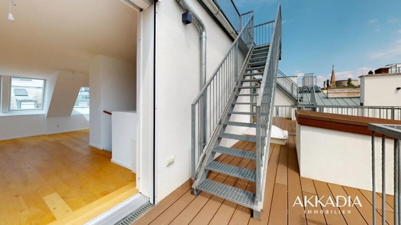 Die Wohnung befindet sich im neu erbauten Dachgeschoß, das per Lift zu erreichen ist. Die Immobilie erstreckt sich über zwei Etagen und besticht mit zwei wunderschönen Terrassen, einem ruhigen Balkon und einer großzügigen Wohnfläche von ca. 95 m². Die Wohnung verfügt in der 1. Etage über einen Vorraum mit Abstellraum, zwei Schlafzimmer, ein Badezimmer mit Badewanne und Dusche sowie ein separates WC. Von beiden Schlafzimmern aus hat man Zugang zu einem Balkon, der sich vor allem im Sommer als optimaler Rückzugsort eignet. Moderne Stufen führen in offenem Stil in die 2. Etage, in der sich die Wohnküche samt Terrassenzugang befindet. Das Herzstück der Wohnung ist die weitläufige Dachterrasse von der aus man einen atemberaubenden Ausblick auf die umliegende Stadt sowie den Prater hat. Darüber hinaus verfügt die Wohnung über eine Fußbodenheizung mit Einzelraumsteuerung sowie über eine Videogegensprechanlage, eine Sicherheitseingangstüre und Alt-Wien-Stil Innentüren. Im gesamten Wohnbereich ist hochwertiger Parkettboden verlegt. Eine Klimaanlage ist vorhanden.