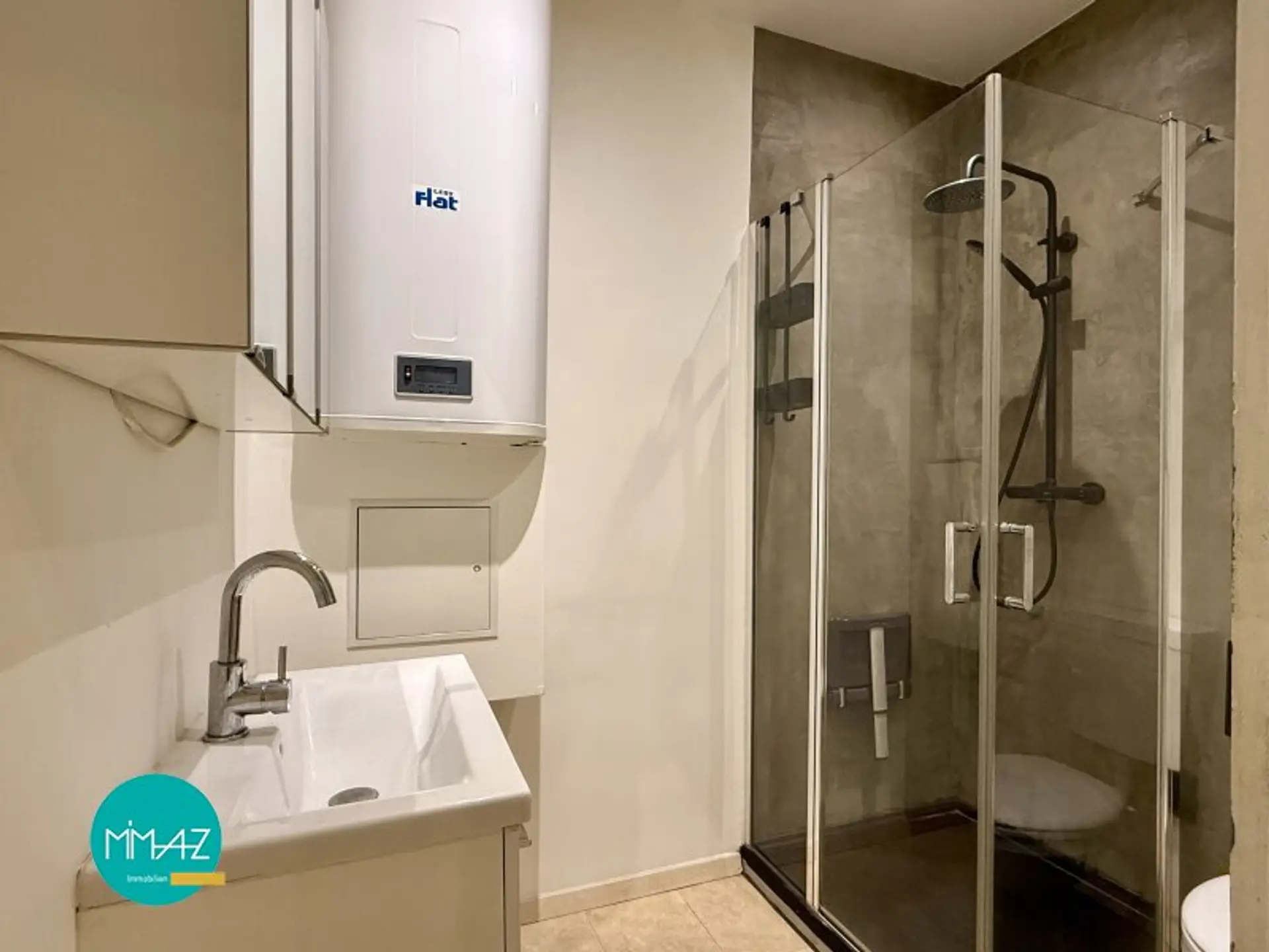 Das Badezimmer ist mit Dusche, Handwaschbecken und WC ausgestattet. Der Waschmaschinenanschluss befindet sich im Vorzimmer, das zusätzliche Stellfläche und Stauraummöglichkeiten bietet.