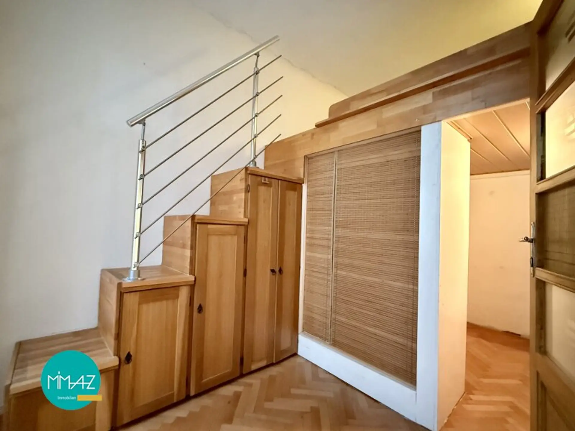 Vom Vorraum aus gelangt man in das Badezimmer sowie in das Wohnzimmer mit integrierter Küche, das zugleich den zentralen Mittelpunkt der Wohnung bildet. Von hier aus ist auch das Schlafzimmer erreichbar – ein gemütlicher Rückzugsort mit cleverem Raumkonzept: ein Hochbett mit begehbarer Garderobe darunter und zusätzlichen Stauraumlösungen entlang des Treppenaufgangs nutzt den Raum optimal aus.