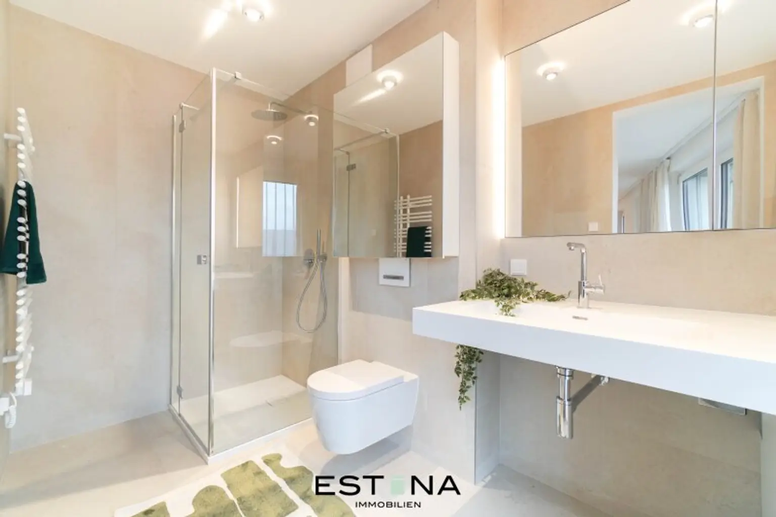 - hochwertiges Badezimmer mit Walk-In-Dusche, Corian-Waschbecken, Waschmaschine, WC und Fenster