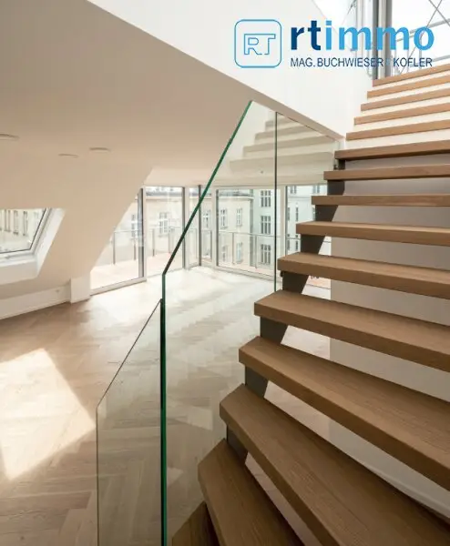 * Die Treppe: Ein echtes Design-Statement. Die interne Treppe mit Holzstufen und einer Glasreling führt elegant in die obere Ebene.