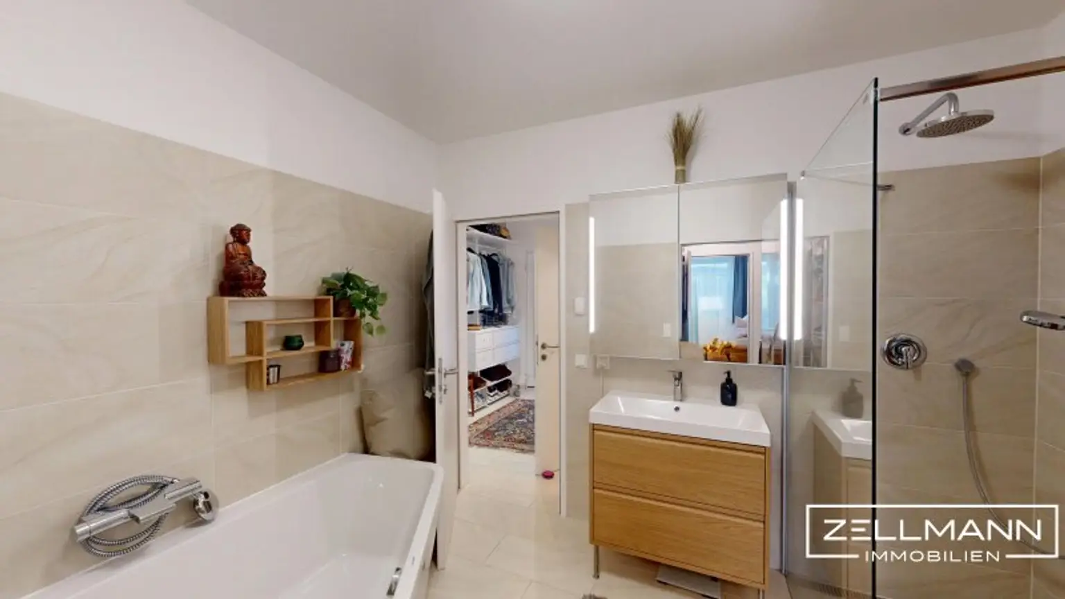 Das Badezimmer präsentiert sich zeitlos und hochwertig mit Dusche und Badewanne. Helle Materialien und eine klare Linienführung sorgen für eine angenehme, ruhige Atmosphäre.