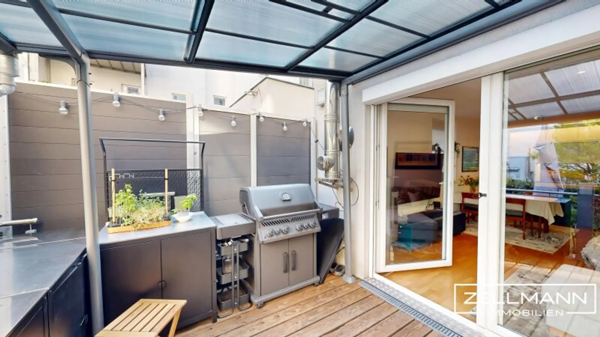 Die Terrasse präsentiert sich als vollwertiger Wohnbereich im Freien. Überdacht und großzügig gestaltet, bietet sie ausreichend Platz für Essbereich, Lounge und entspannte Stunden im Grünen.