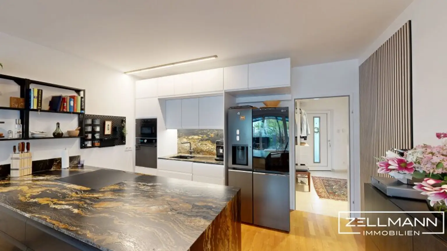 Die höchst moderne Küche fügt sich elegant in den Wohnbereich ein und überzeugt durch ihre klare Gestaltung und hochwertige Ausführung. Sie wird zum zentralen Treffpunkt des Alltags und verbindet Funktionalität mit stilvollem Design.