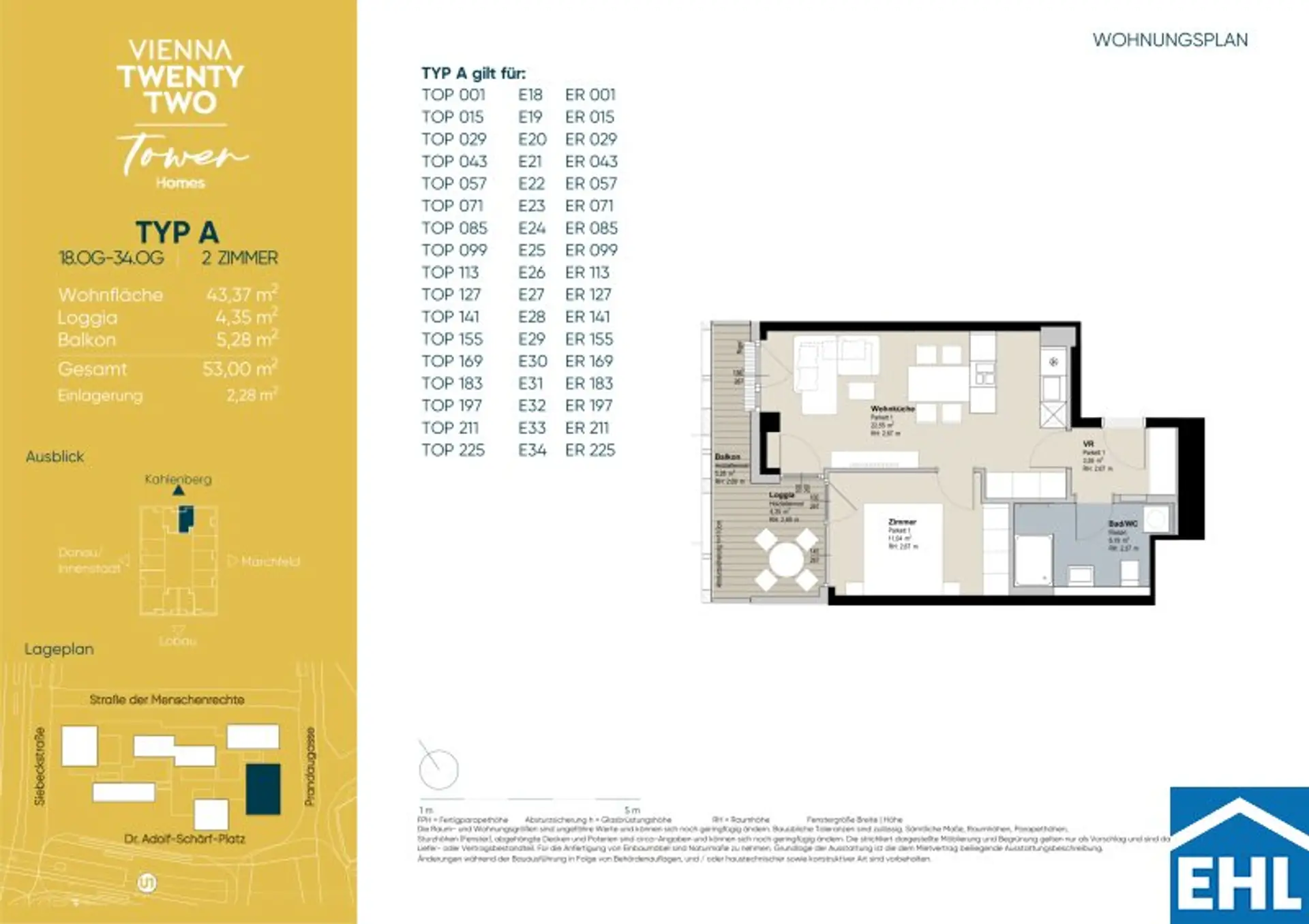 In einzigartiger Lage, direkt bei der U1-Station _Kagran_ und vis-à-vis vom Donau Zentrum, entsteht ein exklusiver, ca. 155m hoher Wohnturm mit 45 Etagen. Die insgesamt 347 Mietwohnungen bieten einen vielfältigen Wohnungsmix: von smart geschnittenen 1,5-Zimmer-Apartments ab ca. 38 m² über komfortable 2-Zimmer-Wohnungen bis hin zu großzügigen 3- und 4-Zimmerwohnungen mit bis zu ca. 80 m².