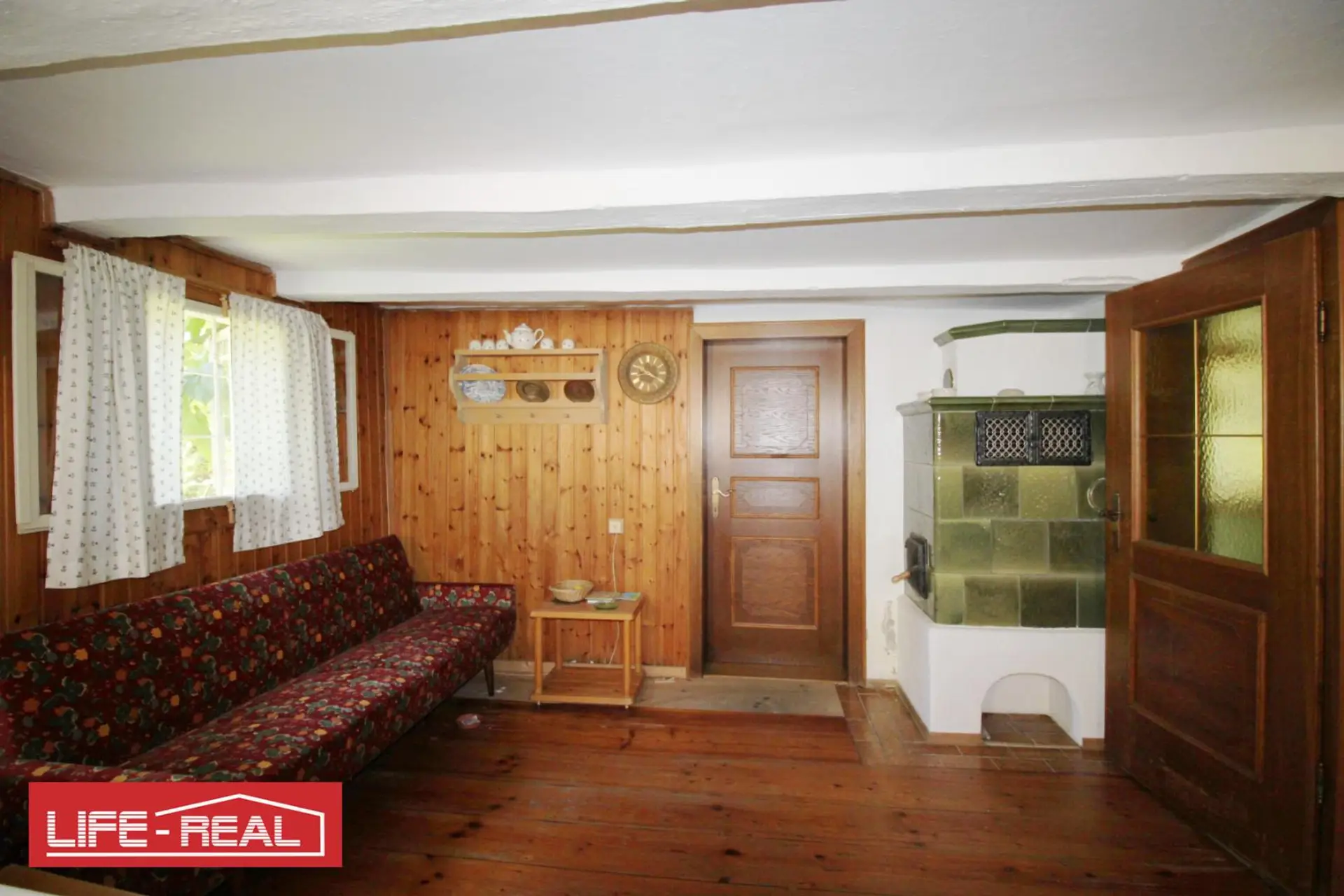 Im Erdgeschoss erwartet Sie eine gemütliche Stube mit traditionellem Kachelofen – zugleich Hauptheizquelle – der für wohlige Wärme sorgt. Eine kleine Küche, ein Badezimmer mit Badewanne sowie ein separates WC sind ebenfalls vorhanden. Das Erdgeschoss wird durch ein kleines Schlafzimmer, einen Kellerraum, einen Lagerraum und einen großzügigen Flur ergänzt.