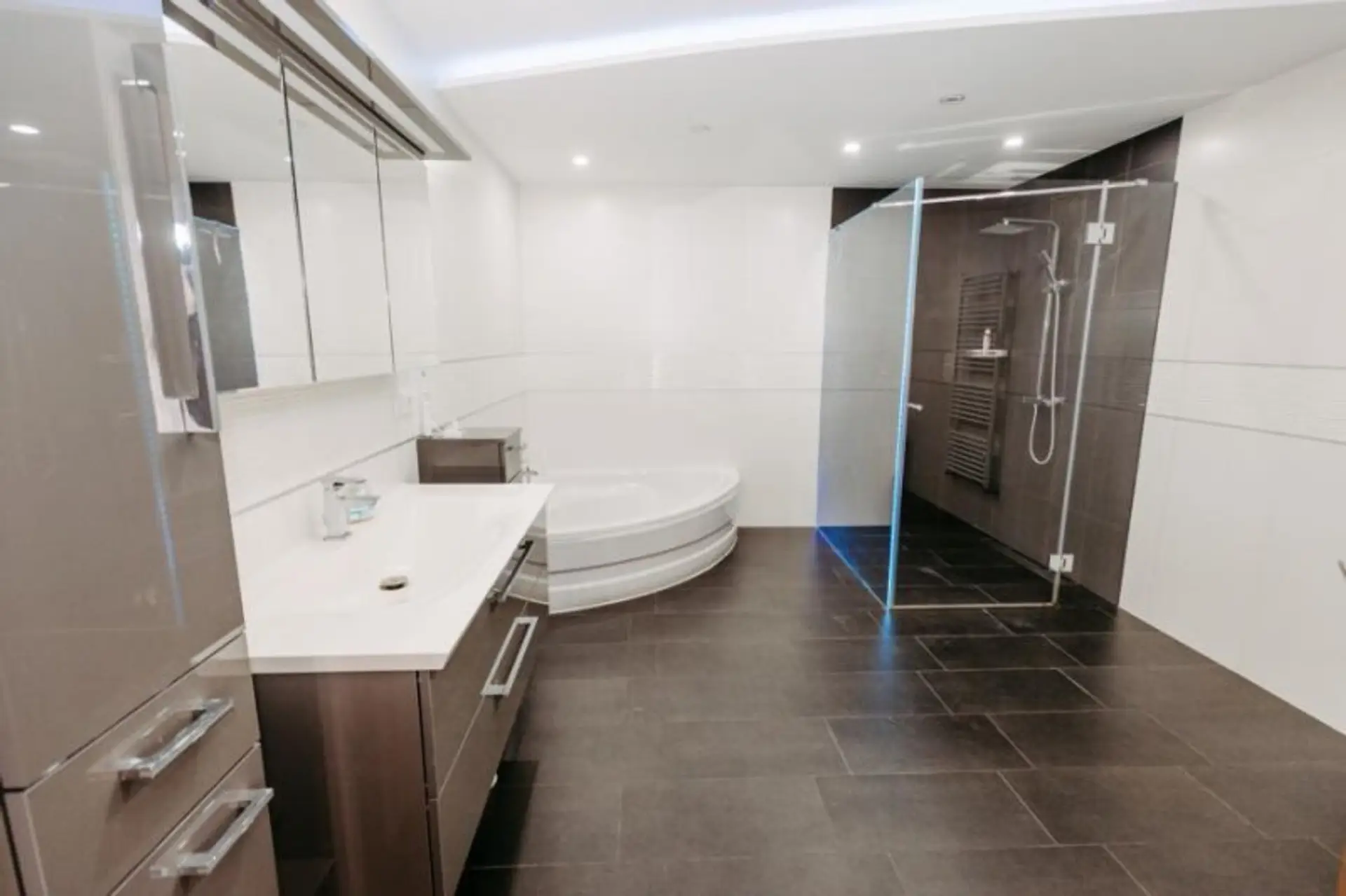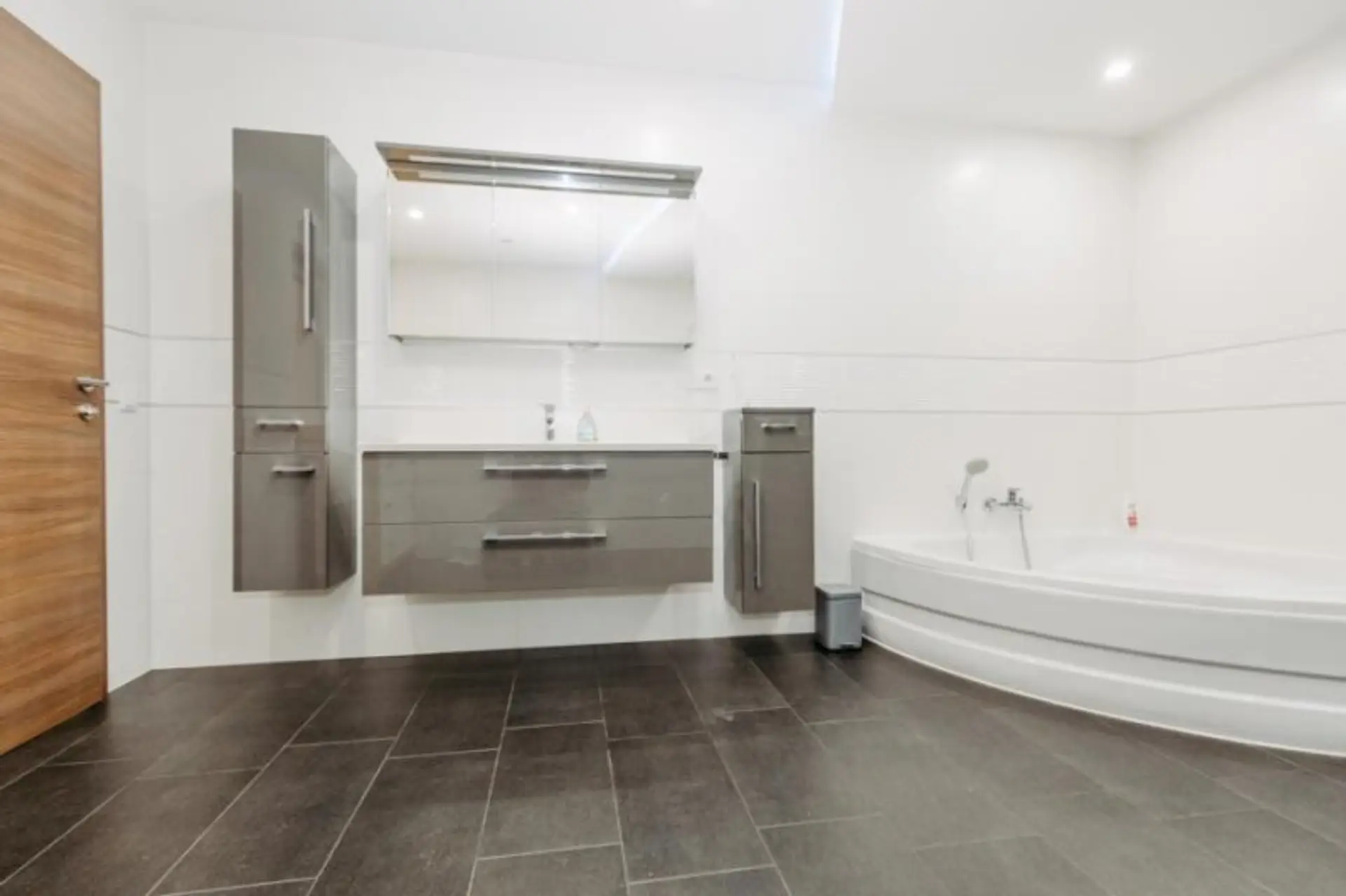 großes Bad (Wanne und Dusche), 2 WC, Heiztechnikraum Luft- Wärmepumpe (Fußbodenheizung), Wäscheraum, Stüberl, Terrassenausgang