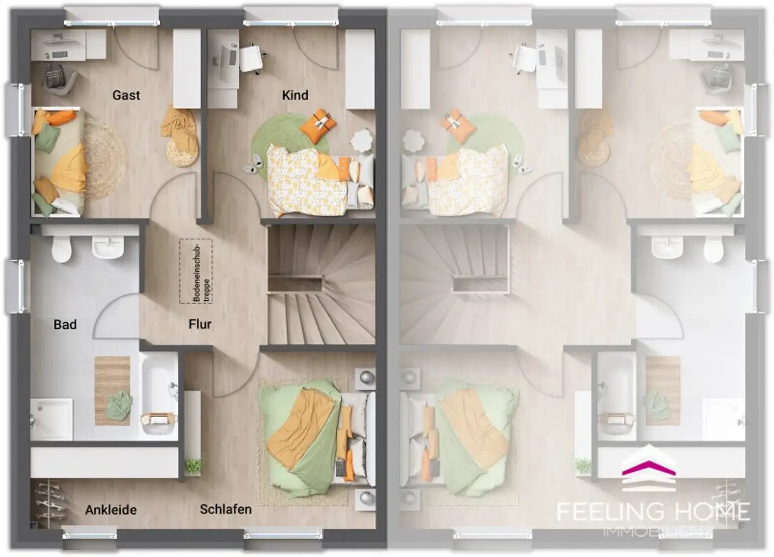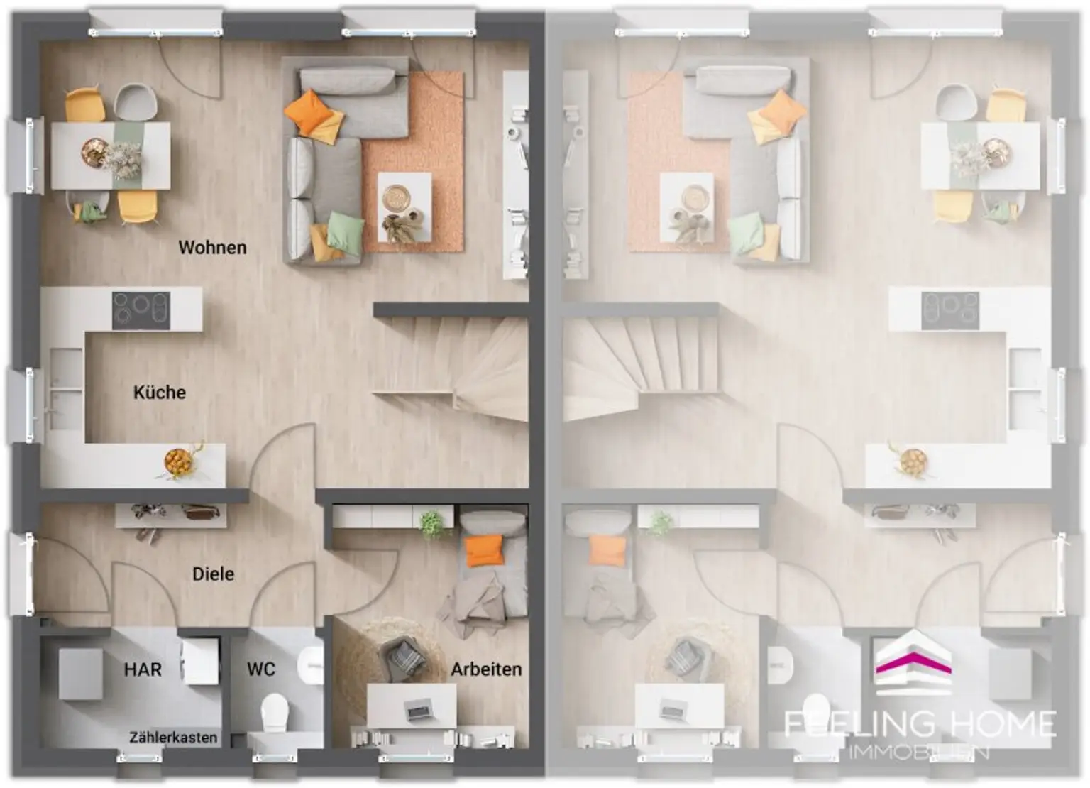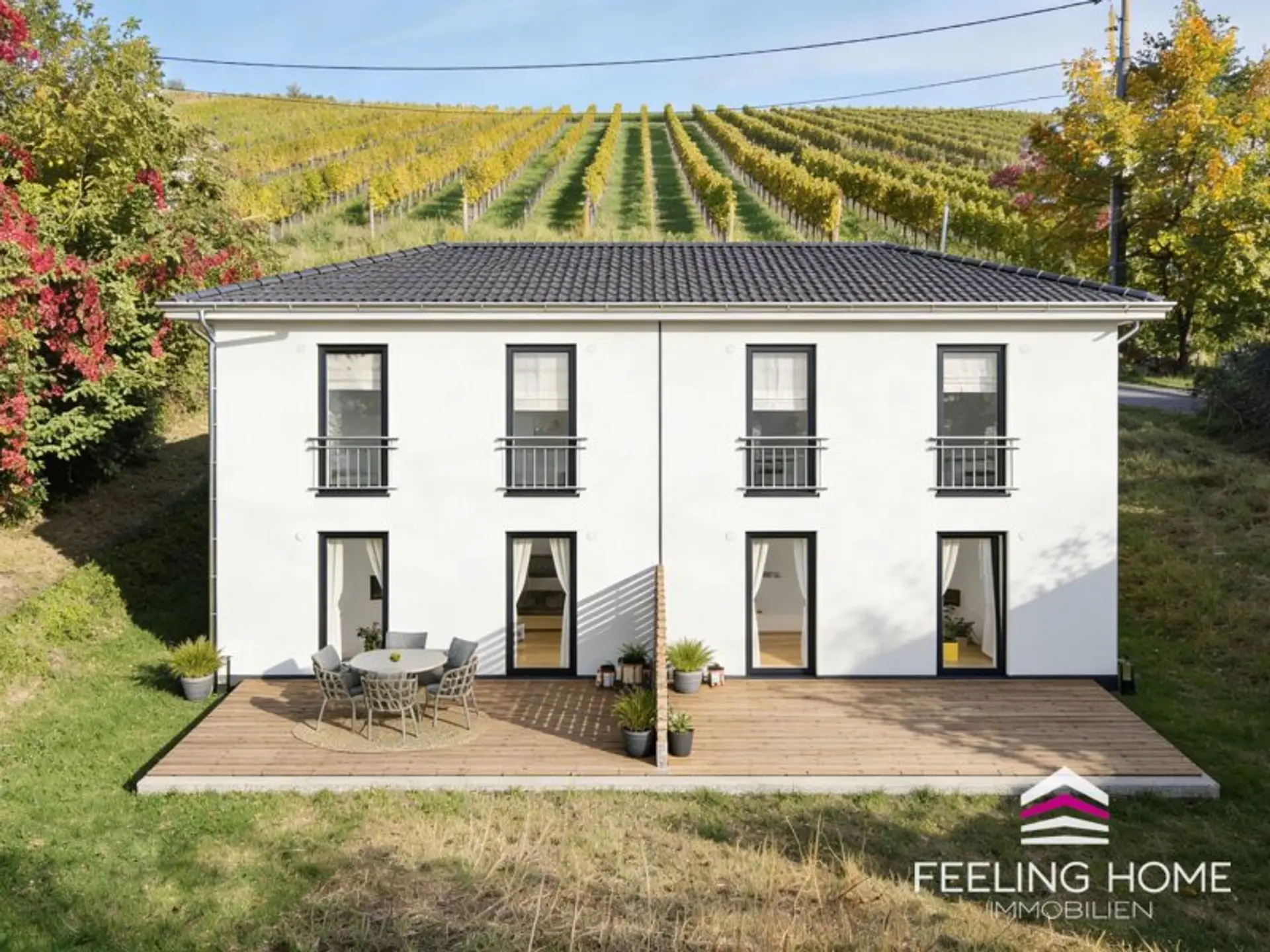 Bis auf die Grundstücksfotos, darf ich freundlichst verweisen, dass die Renderings ein mögliches Wohnambiente simulieren und das Doppelhaus mit Hilfe von KI in das Grundstück implementiert wurde.
