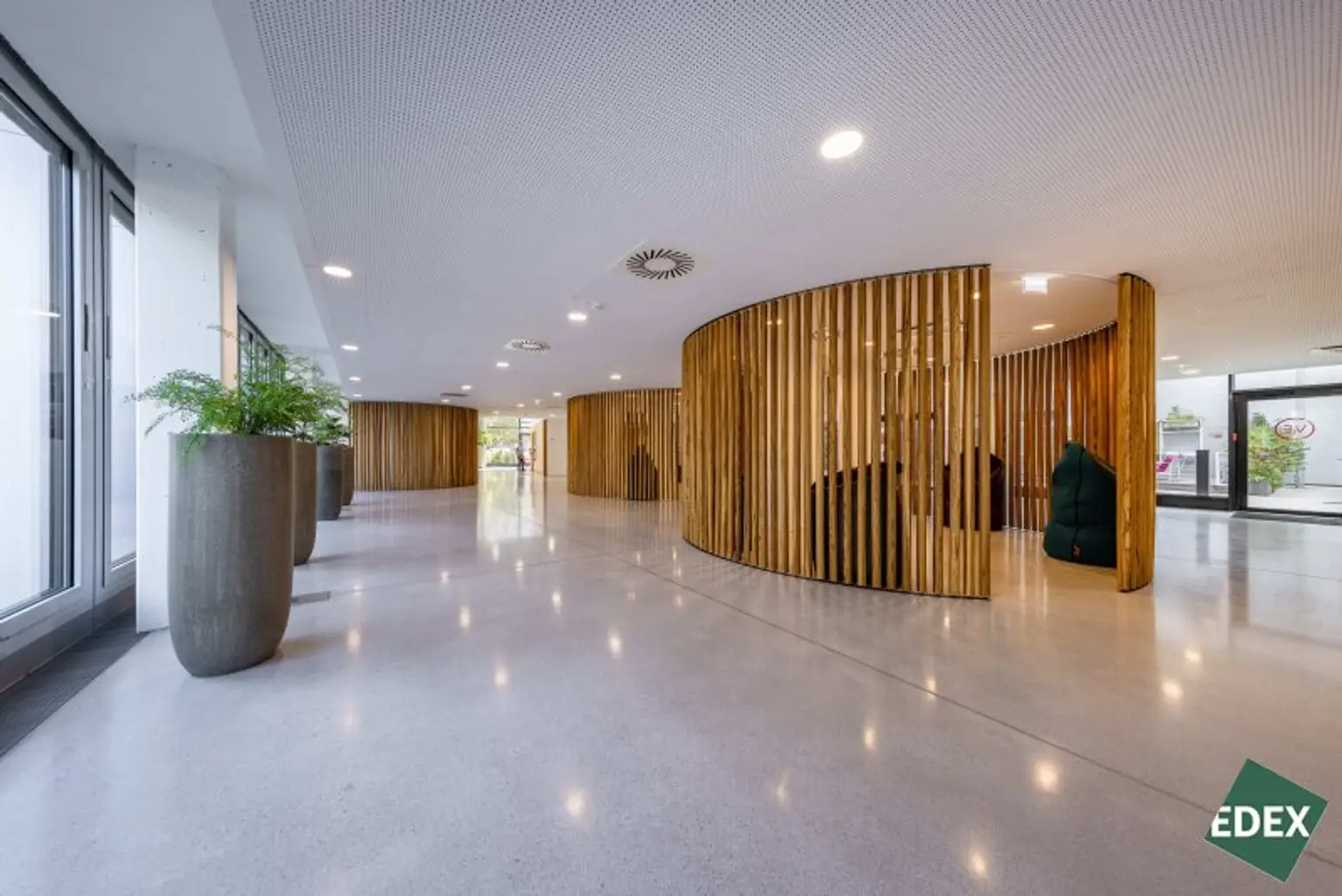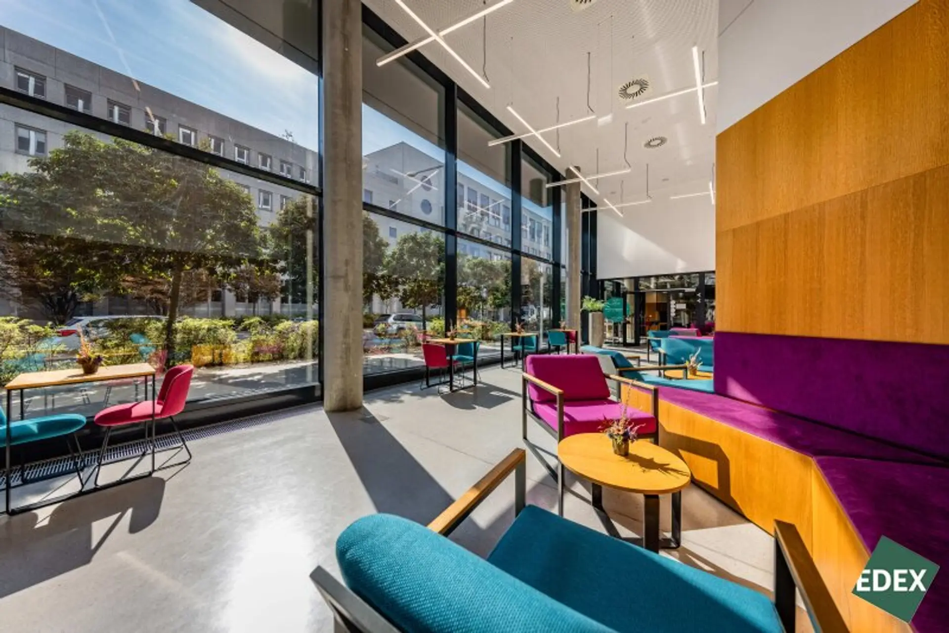 Die repräsentative Lobby mit Empfang und großzügigen Aufenthalts- und Arbeitsbereichen sowie die umfassende Infrastruktur direkt im Gebäude (Billa, La ViE Bistro) sowie am Gelände bieten Ihnen alle Annehmlichkeiten, die das Arbeiten in Ihrem neuen Büro angenehm machen.