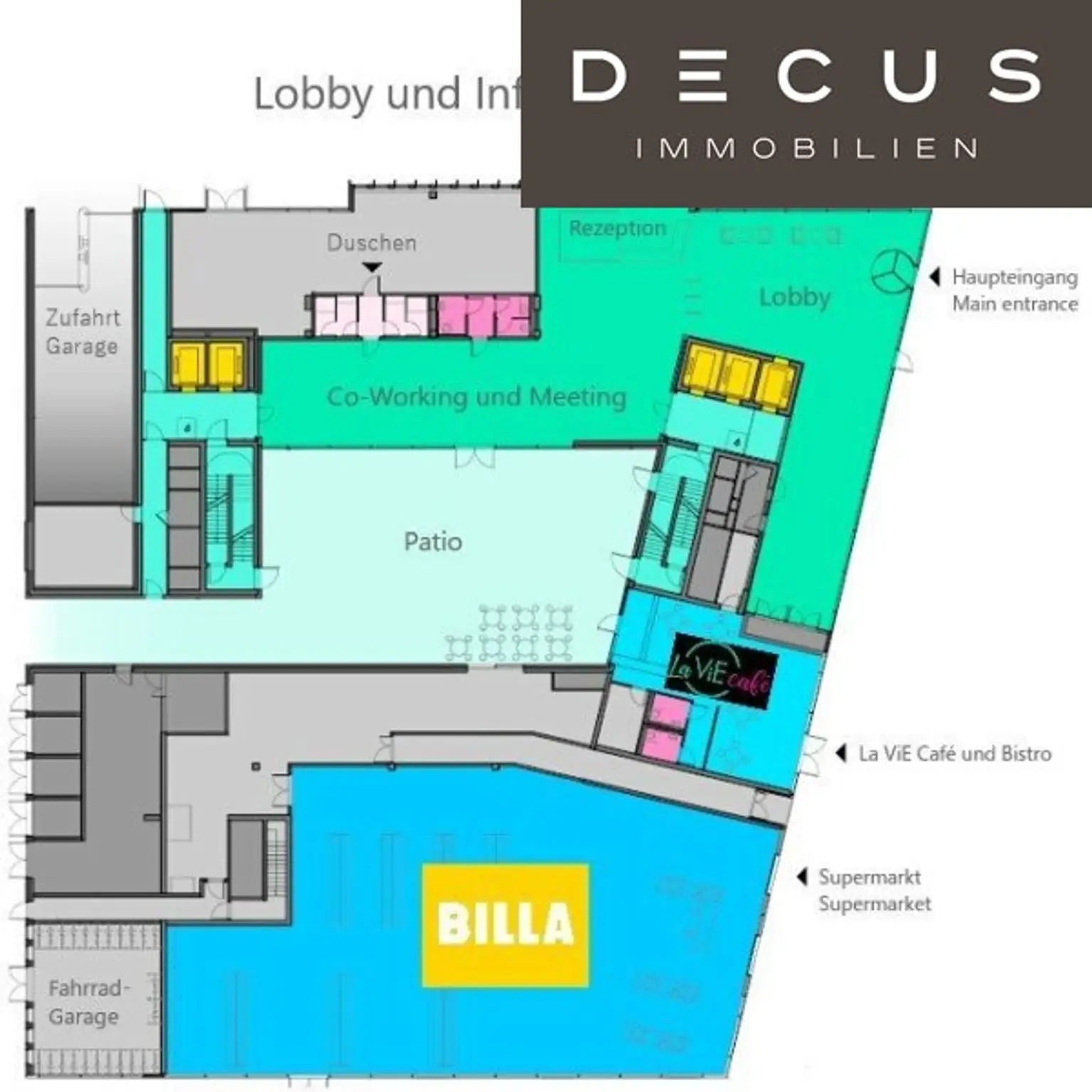umfassende Infrastruktur direkt im Gebäude (Billa, La ViE Bistro) sowie am Gelände (Brass Monkey Cafe, Restaurant Ebi, SV Kantine, Fit Inn Fitnessstudio) bieten Ihnen alle Annehmlichkeiten, die das Arbeiten in Ihrem neuen Büro angenehm machen. Die allgemeinen Räumlichkeiten im gegenüberliegenden CA Immo Bürocluster Lände wie Veranstaltungsraum inkl. Serviceleistungen und der Gymnastikraum können von Mietern des ViE genutzt werden.