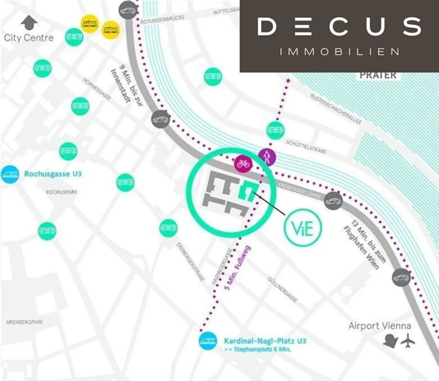 Noch schneller sind Sie aufgrund der direkten Anbindung an den Donaukanalradweg mit dem Fahrrad unterwegs (8 Min. bis zur Innenstadt). Für Sportler bietet das ViE neben Duschen und Garderoben im EG auch einen sicheren Abstellplatz für Fahrräder.