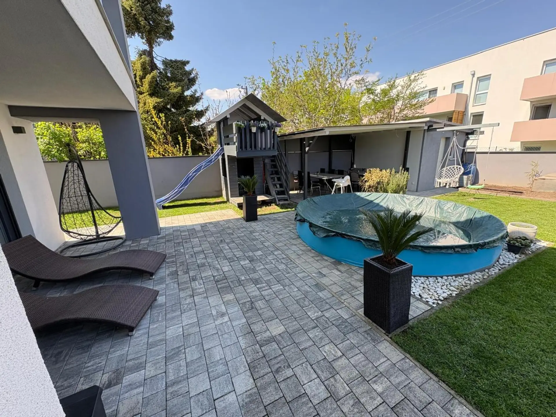 Der kleine, gepflegte Garten mit Pergola, bietet ausreichend Platz zum Entspannen, ohne dabei viel Pflegeaufwand zu verursachen.