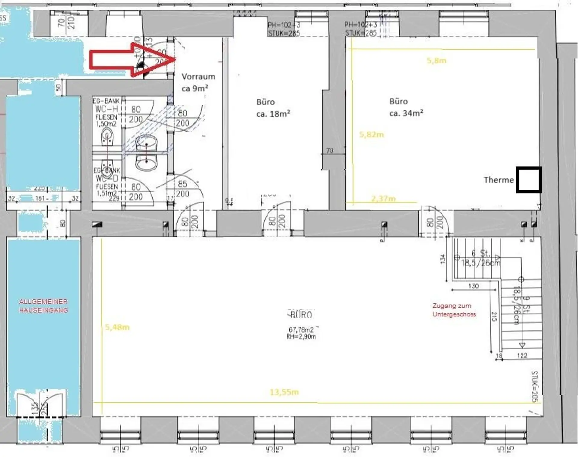 Erdgeschoss-Büro mit trockenem Keller-Lager (Gesamtfläche: 170,34 m²) in der Apostelgasse in optimaler Lage direkt ums Eck der beliebten Landstraßer Hauptstraße.