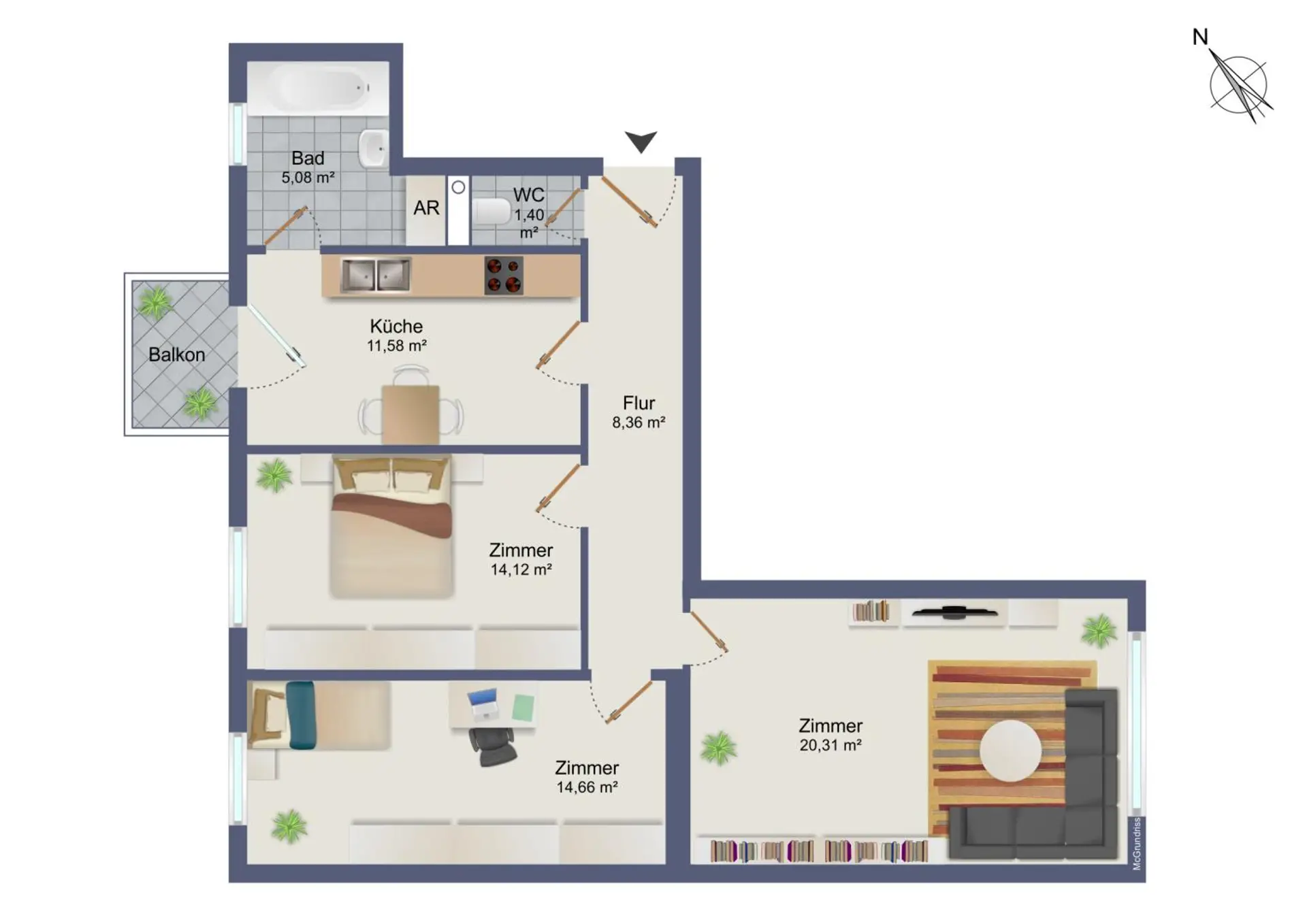 Die Wohnung bietet rund 75 m² Wohnfläche und vereint funktionale Planung mit guter Nutzbarkeit: