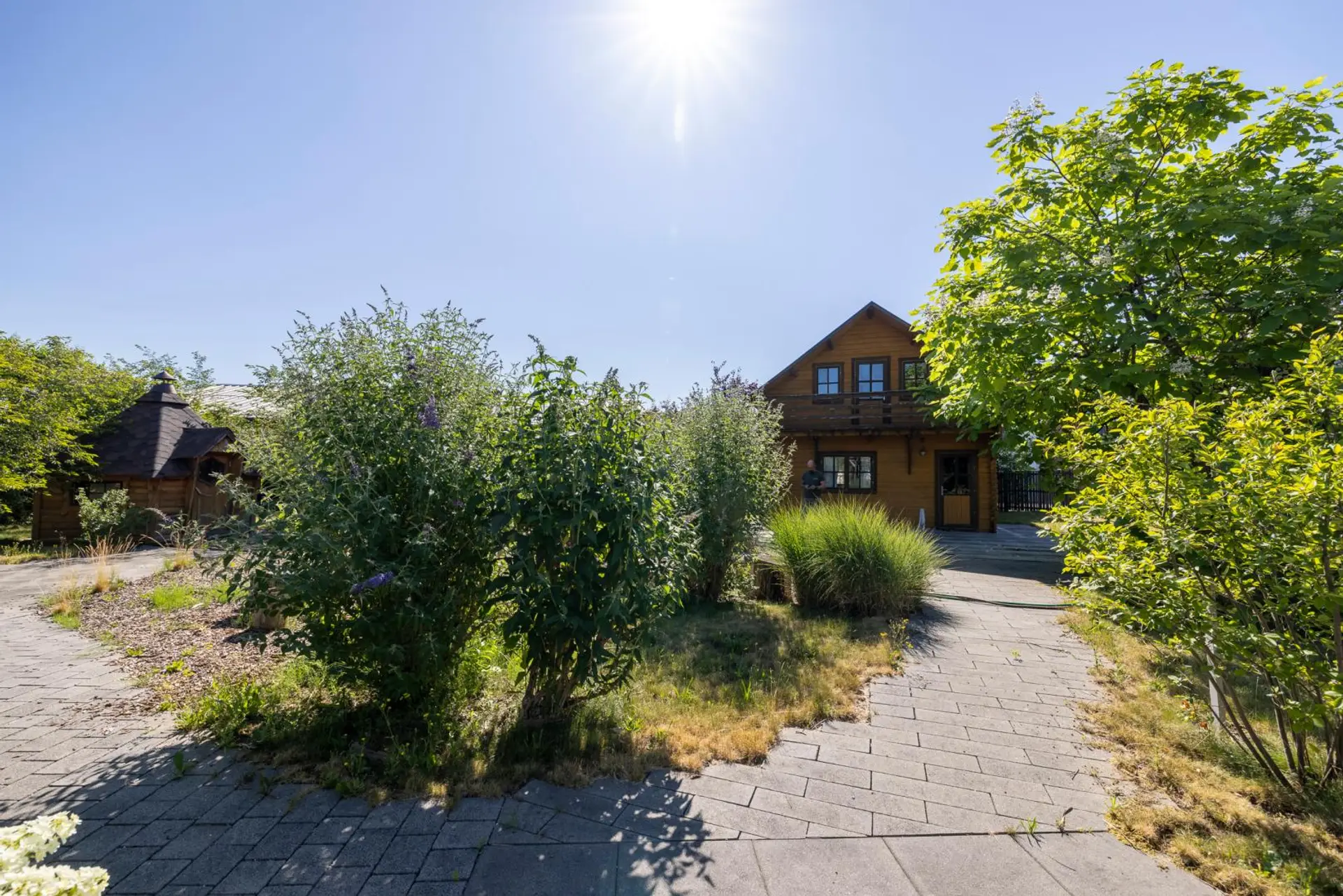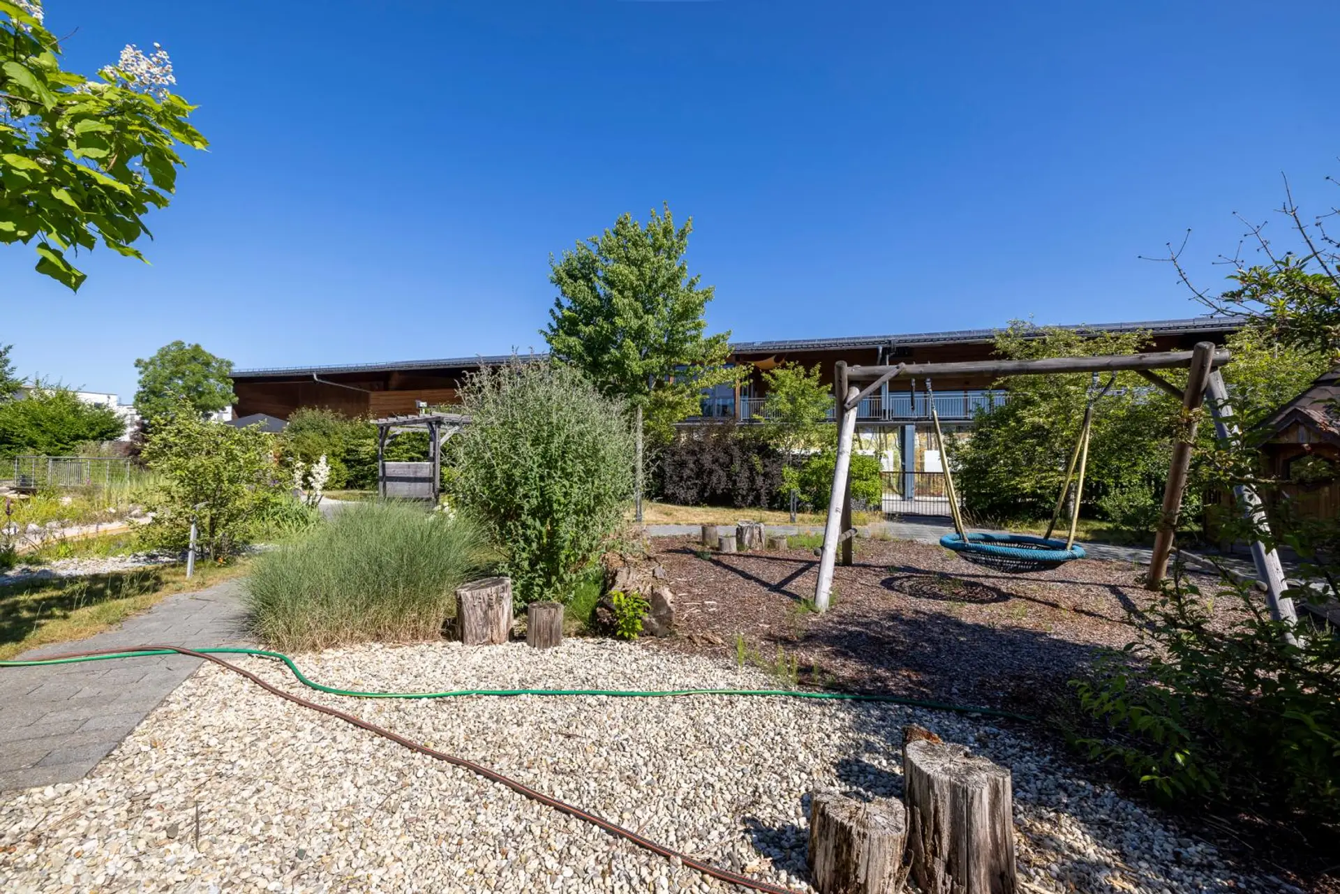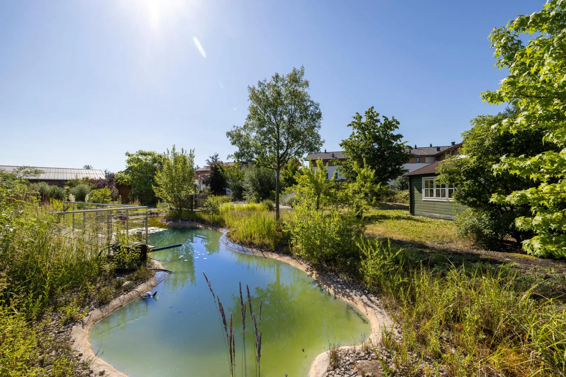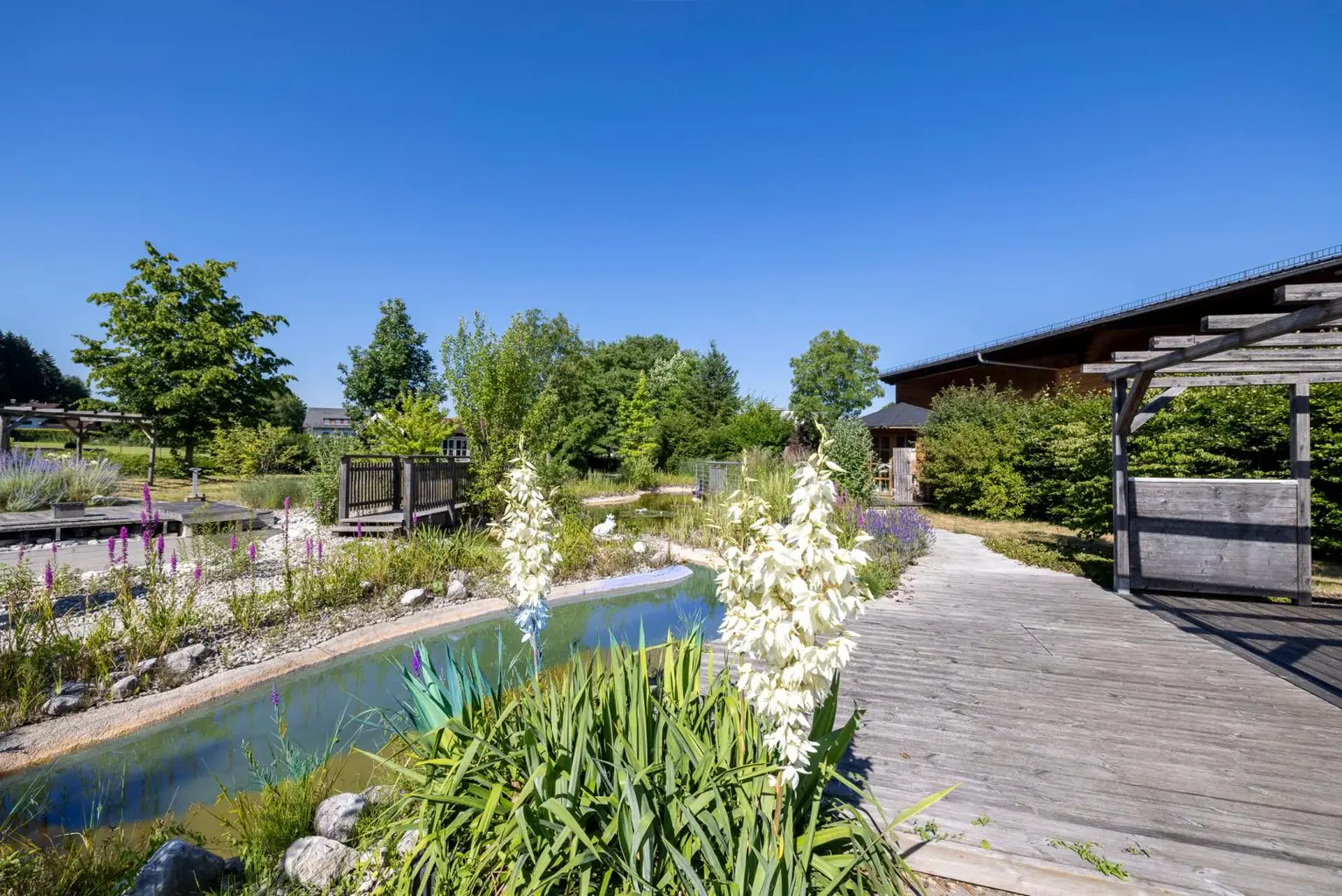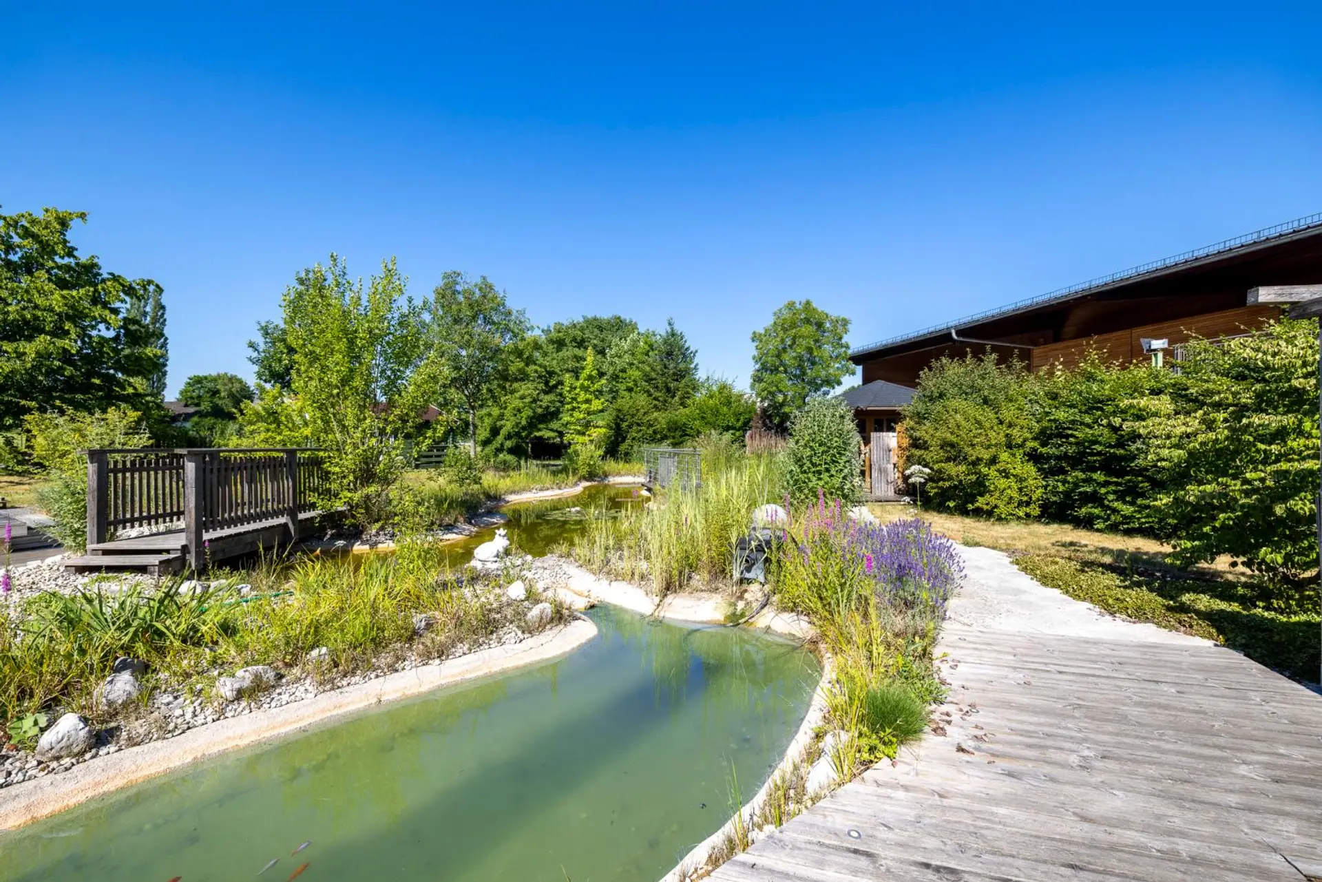 Ein liebevoll gestalteter Gartenbereich sorgt für eine besondere Aufenthaltsqualität. Herzstück ist ein beeindruckender Schwimmteich sowie ein Schauteich mit Flusslauf. Ein uriges Boots- bzw. Gartenhaus sowie eine kleine, feine Gartenhütte ergänzen das Ensemble. Die gesamte Gartenanlage ist durchdacht und harmonisch bepflanzt.