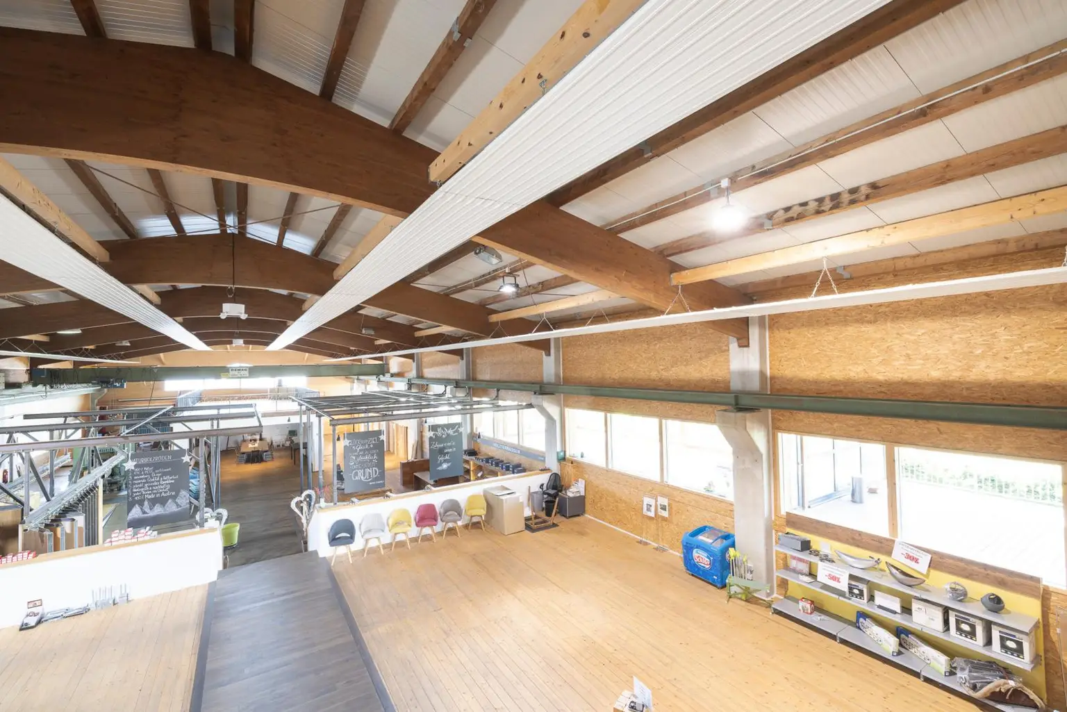 Das Gebäude besticht durch ein außergewöhnliches Ambiente mit lichten Raumhöhen. Der repräsentative Eingangsbereich mit einem breiten Aufgang unterstreicht den hochwertigen Charakter der Immobilie. Die Halle ist als Leimbinderkonstruktion ohne tragende Säulen ausgeführt und ermöglicht dadurch eine optimale und flexible Nutzung.